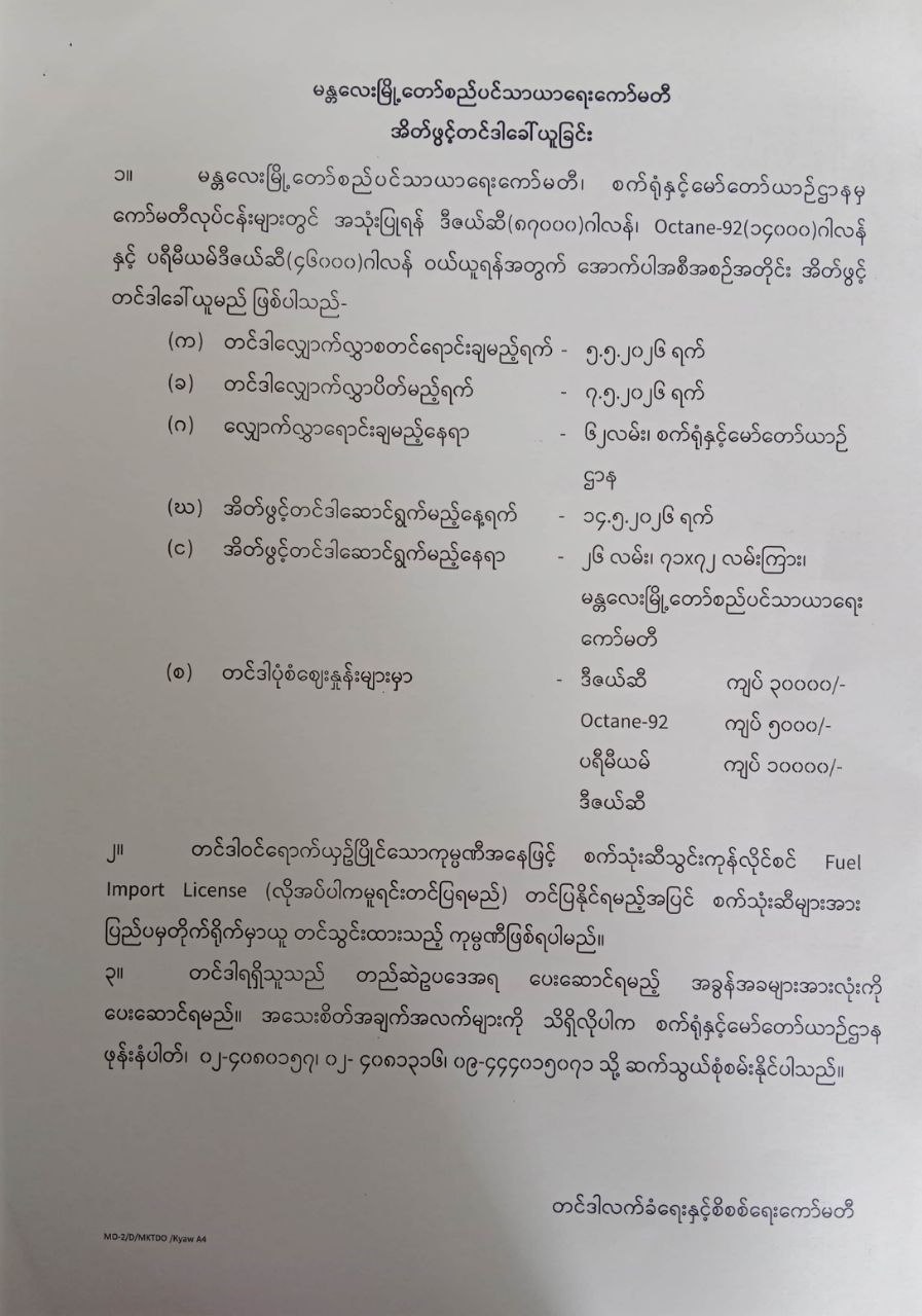 မန္တလေးမြို့တော်စည်ပင်သာယာရေးကော်မတီ၊ စက်ရုံနှင့်မော်တော်ယာဥ်ဌာနမှ အိတ်ဖွင့်တင်ဒါခေါ်ယူခြင်း