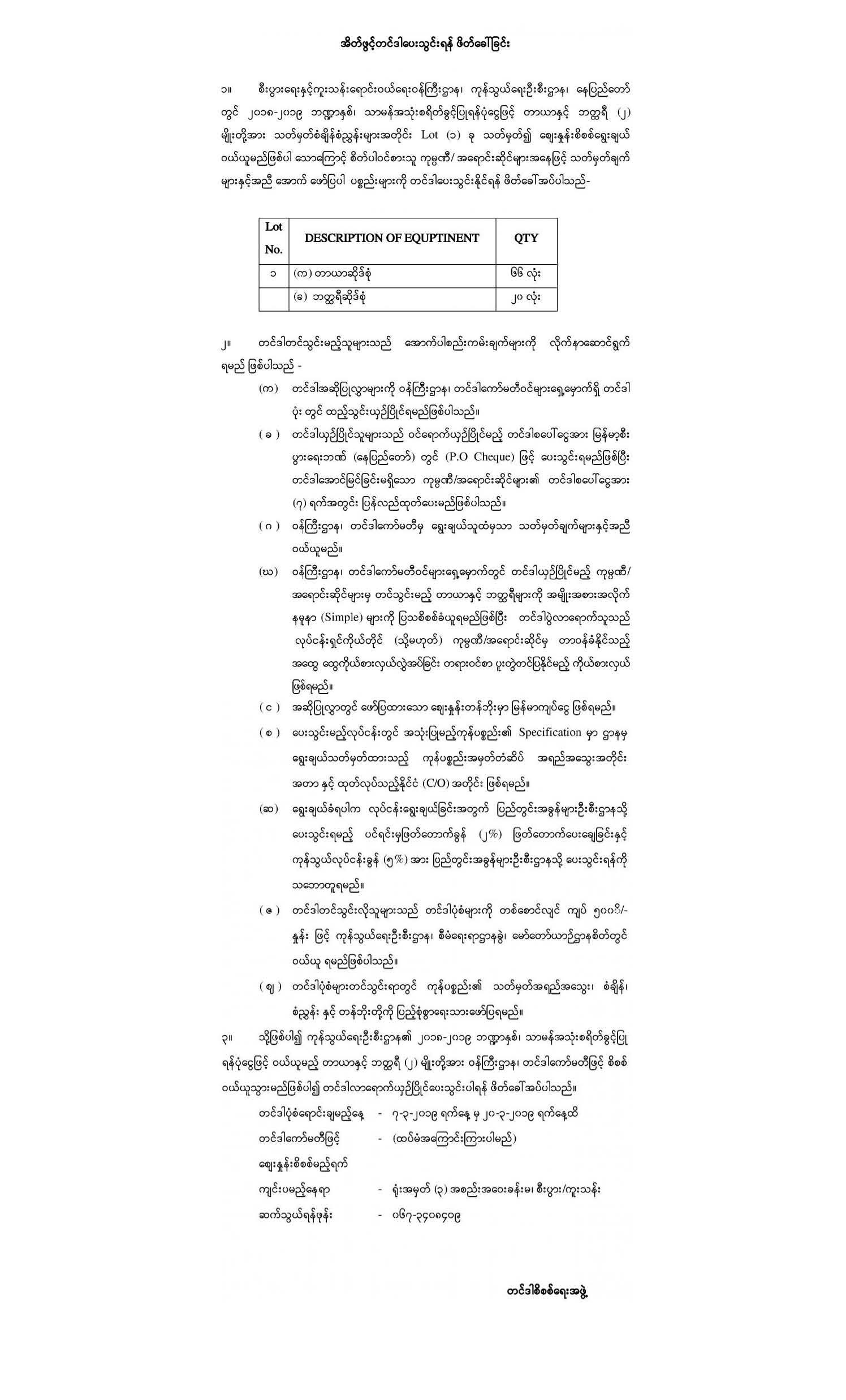 ပတ်ဝန်းကျင်အရည်အသွေးတိုင်းတာရေး ကိရိယာများ နှင့် ဓာတ်ခွဲခန်းတွင် အသုံးပြုမည့် တိုင်းတာရေးပစ္စည်း (Solution) များ၊ ရုံးသုံးပရိဘောဂပစ္စည်းများ၊ ရုံးသုံးပစ္စည်းများနှင့် စက်ကိရိယာများကို မြန်မာကျပ်ငွေဖြင့် အိတ်ဖွင့်တင်ဒါ ခေါ်ယူခြင်း
