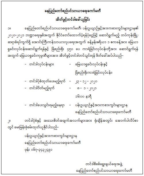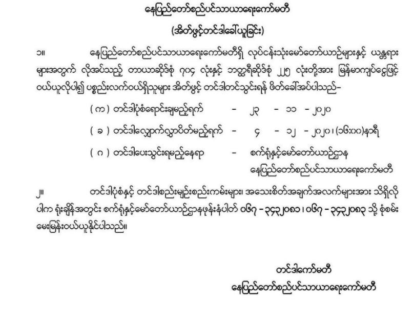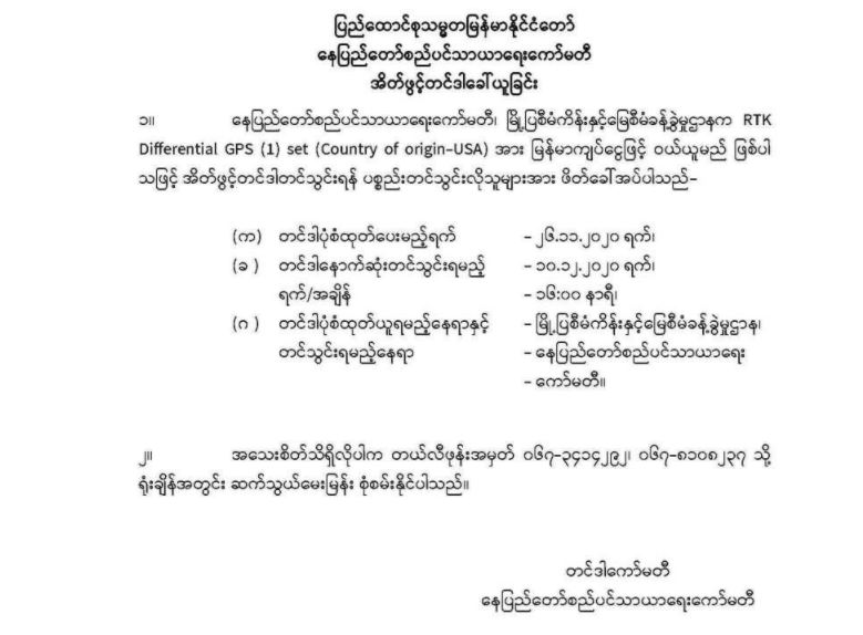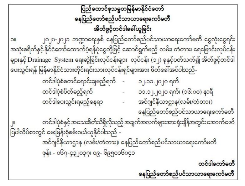 နေပြည်တော်စည်ပင်သာယာရေးကော်မတီ၊ မြို့ပြစီမံကိန်းနှင့်မြေစီမံခန့်ခွဲရေးဌာန မှ အိတ်ဖွင့်တင်ဒါခေါ်ယူခြင်း