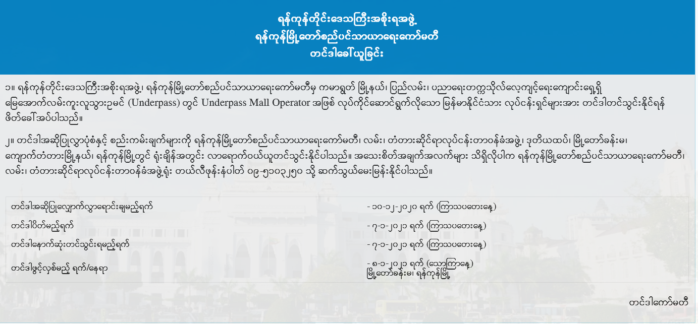 ရန်ကုန်တိုင်းဒေသကြီးအစိုးရအဖွဲ့၊ ရန်ကုန်မြို့တော်စည်ပင်သာယာရေးကော်မတီမှ တင်ဒါခေါ်ယူခြင်း