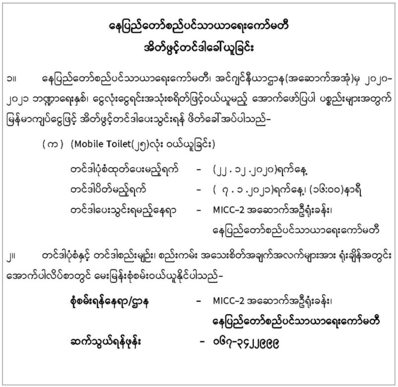 နေပြည်တော်စည်ပင်သာယာရေးကော်မတီ၊ အင်ဂျင်နီယာဌာန (အဆောက်အအုံ) မှ Mobile Toilet (25)လုံး ဝယ်ယူရန် အိတ်ဖွင့်တင်ဒါခေါ်ယူခြင်း