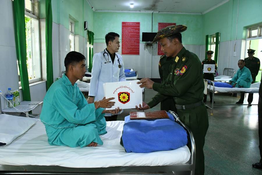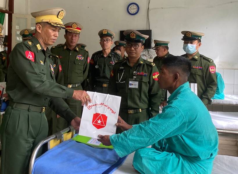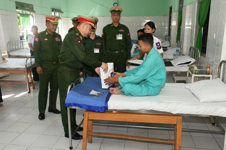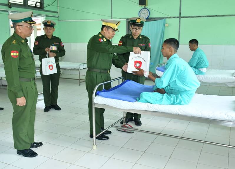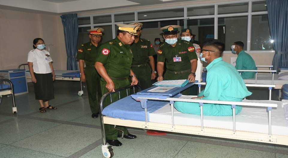 ရှမ်းပြည်နယ်(တောင်ပိုင်း) အောင်ပန်းမြို့နှင့်ခိုလမ်မြို့တို့ရှိ တပ်မတော်ဆေးရုံများ၊ ရှမ်းပြည်နယ်(အရှေ့ပိုင်း) ကျိုင်းတုံမြို့ရှိတပ်မတော်ဆေးရုံ၊ တနင်္သာရီတိုင်းဒေသကြီး မြိတ်မြို့ရှိ တပ်မတော်ဆေးရုံ၊ ရန်ကုန်တိုင်းဒေသကြီး မင်္ဂလာဒုံမြို့နယ်ရှိ တပ်မတော်အရိုးရောဂါ အထူးကုဆေးရုံကြီး(ခုတင်-၅၀၀)နှင့် တပ်မတော်ဆေးရုံကြီး(ခုတင်-၁၀၀၀)၊ မန္တလေးတိုင်းဒေသကြီး၊ မန္တလေးမြို့ နန်းမြို့တွင်းရှိ တပ်မတော်ဆေးရုံနှင့် ပဲခူးတိုင်းဒေသကြီး တောင်ငူမြို့ရှိ တပ်မတော်ဆေးရုံတို့၌ တက်ရောက်ဆေးကုသမှုခံယူလျက်ရှိသော အရာရှိ၊ စစ်သည်၊ မိသားစုဝင်များ၊ ပြည်သူ့စစ်မှုထမ်းများ၊ စစ်မှုထမ်းဟောင်းအဖွဲ့ဝင်များ၊ မြန်မာနိုင်ငံရဲတပ်ဖွဲ့ဝင်များ၊ ပြည်သူ့စစ်(ဌာနေ)တပ်ဖွဲ့ဝင်များနှင့် ဒေသခံပြည်သူများအား ယနေ့တွင် သက်ဆိုင်ရာ တိုင်းစစ်ဌာနချုပ်များမှ တိုင်းမှူးများနှင့်တာဝန်ရှိသူများက သွားရောက်ကြည့်ရှု၍ တစ်ဦးချင်း၏ ရောဂါဖြစ်ပွားမှု၊ ဆေးဝါးကုသပေးထားမှုနှင့် ကျန်းမာရေးတိုးတက်ကောင်းမွန်မှုအခြေအနေများကို မေးမြန်းအားပေးစကားပြောကြားပြီး အာဟာရဖြည့်စားသောက်ဖွယ်ရာများနှင့် ချီးမြှင့်ငွေများပေး အပ်ကြသည်။ ထို့နောက် တိုင်းစစ်ဌာနချုပ်အလိုက် တိုင်းမှူးများနှင့်တာဝန်ရှိသူများသည် ဆေးရုံများအတွင်း လှည့်လည်ကြည့်ရှုစစ်ဆေး၍ လိုအပ်သည်များညှိနှိုင်းဆောင်ရွက်ပေးခဲ့ကြောင်း သတင်းရရှိသည်။