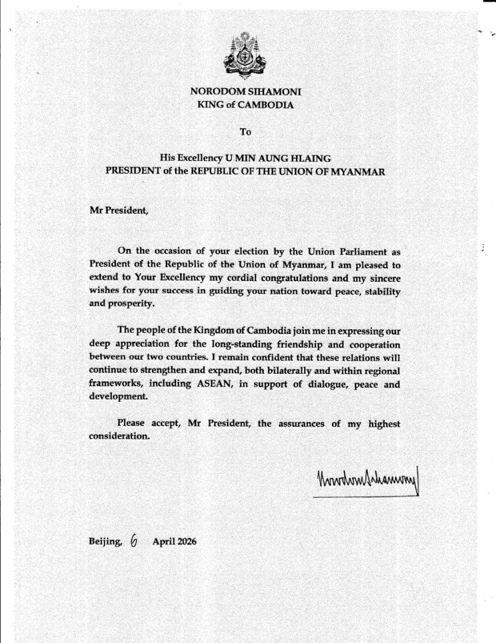 ပြည်ထောင်စုသမ္မတမြန်မာနိုင်ငံတော်၊ ရွေးကောက်တင်မြှောက်ခြင်းခံရသော သမ္မတ၊ နိုင်ငံတော်လုံခြုံရေးနှင့်အေးချမ်းသာယာရေးကော်မရှင်ဥက္ကဋ္ဌ ဗိုလ်ချုပ်မှူးကြီး မင်းအောင်လှိုင်ထံသို့ ကမ္ဘောဒီးယားနိုင်ငံ ဘုရင်မင်းမြတ် ပရယ်ဘတ် ဆမ်ဒက်ပရယ် ဘိုရိုနစ် နိုရိုဒွန် သီဟာမိုနီထံမှ ဝမ်းမြောက်ကြောင်းသဝဏ်လွှာ ပေးပို့