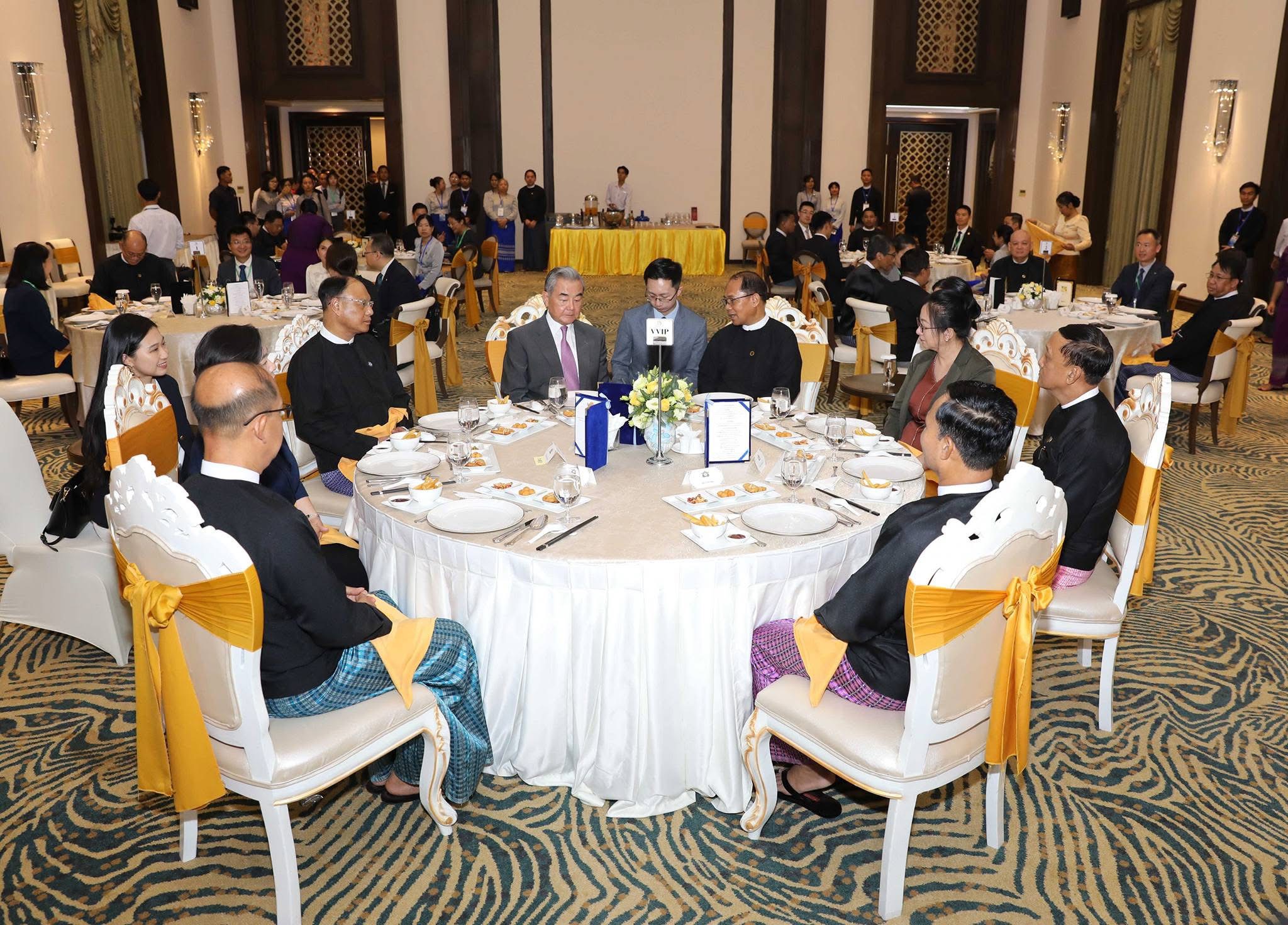 ဆက်လက်၍ နိုင်ငံခြားရေးဝန်ကြီးဌာန၊ ပြည်ထောင်စုဝန်ကြီး ဦးတင်မောင်ဆွေ က တရုတ်ကွန်မြူနစ်ပါတီ ဗဟိုကော်မတီ၊ နိုင်ငံရေးရာဗျူရို အဖွဲ့ဝင်နှင့် နိုင်ငံခြားရေးဝန်ကြီး ဦးဆောင်သော ကိုယ်စားလှယ်အဖွဲ့အား ယနေ့ညနေပိုင်းတွင် နေပြည်တော်ရှိ Jasmine Hotel ၌ ညစာစားပွဲဖြင့် တည်ခင်းဧည့်ခံခဲ့သည်။