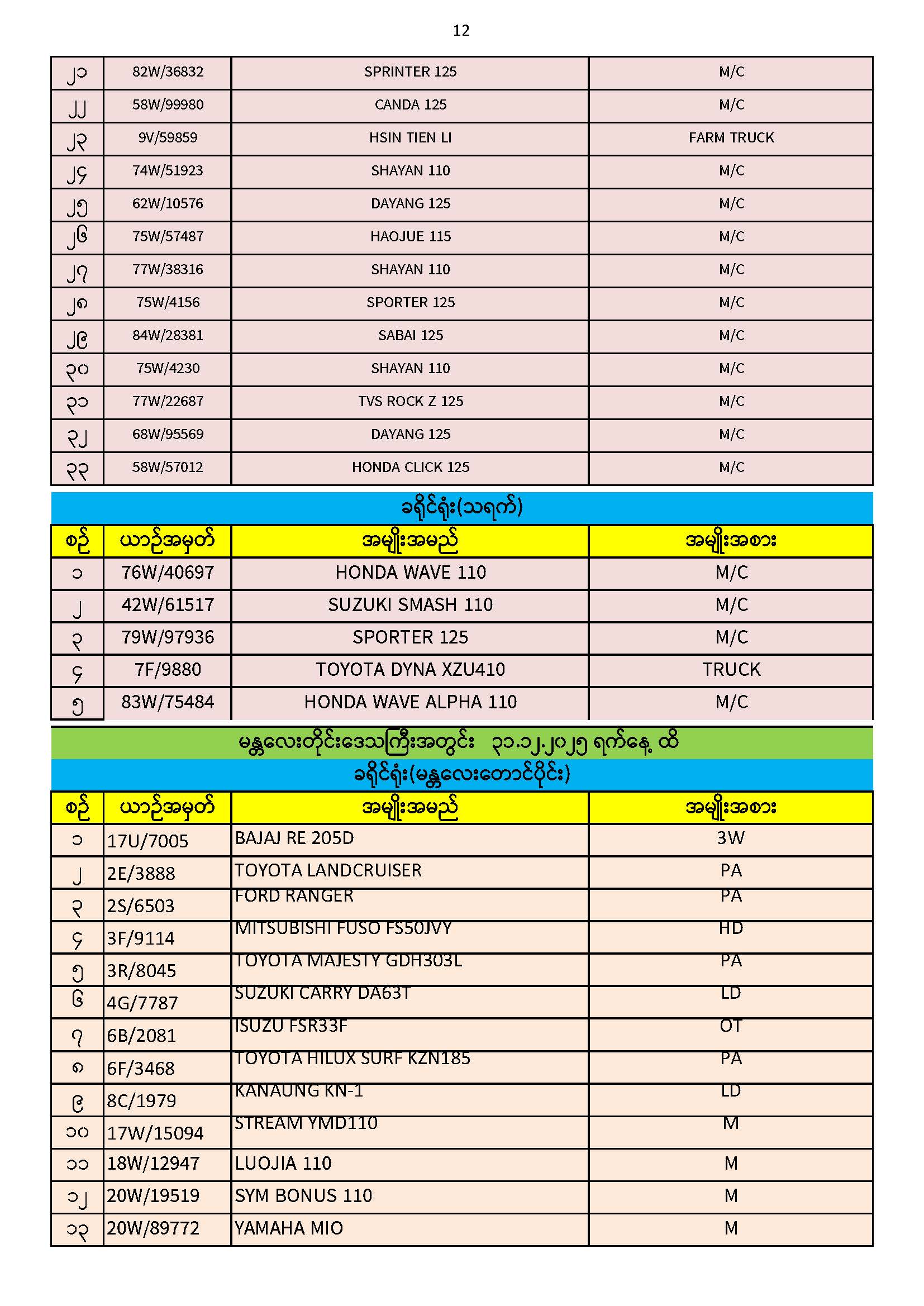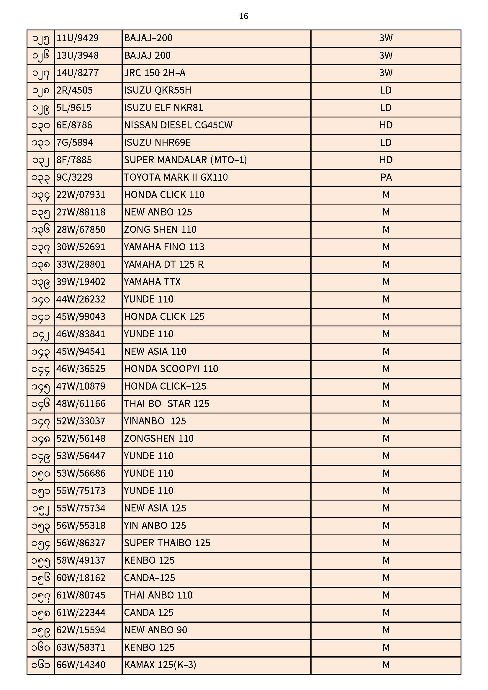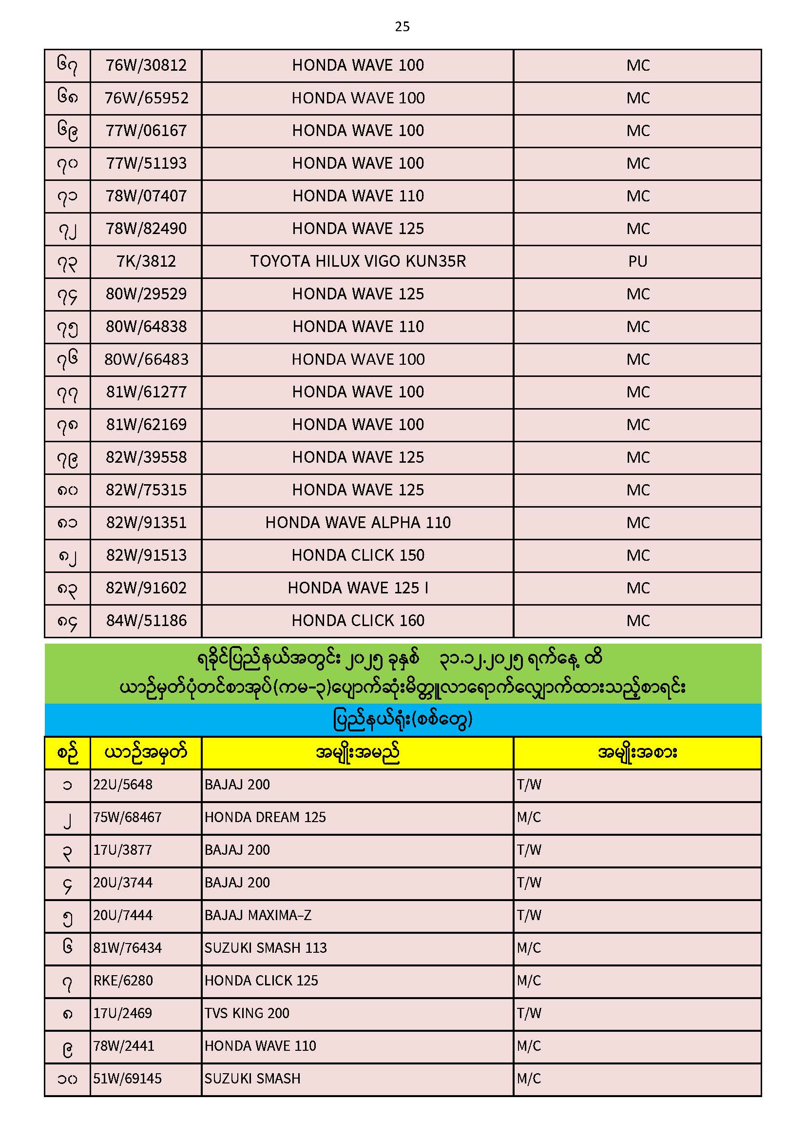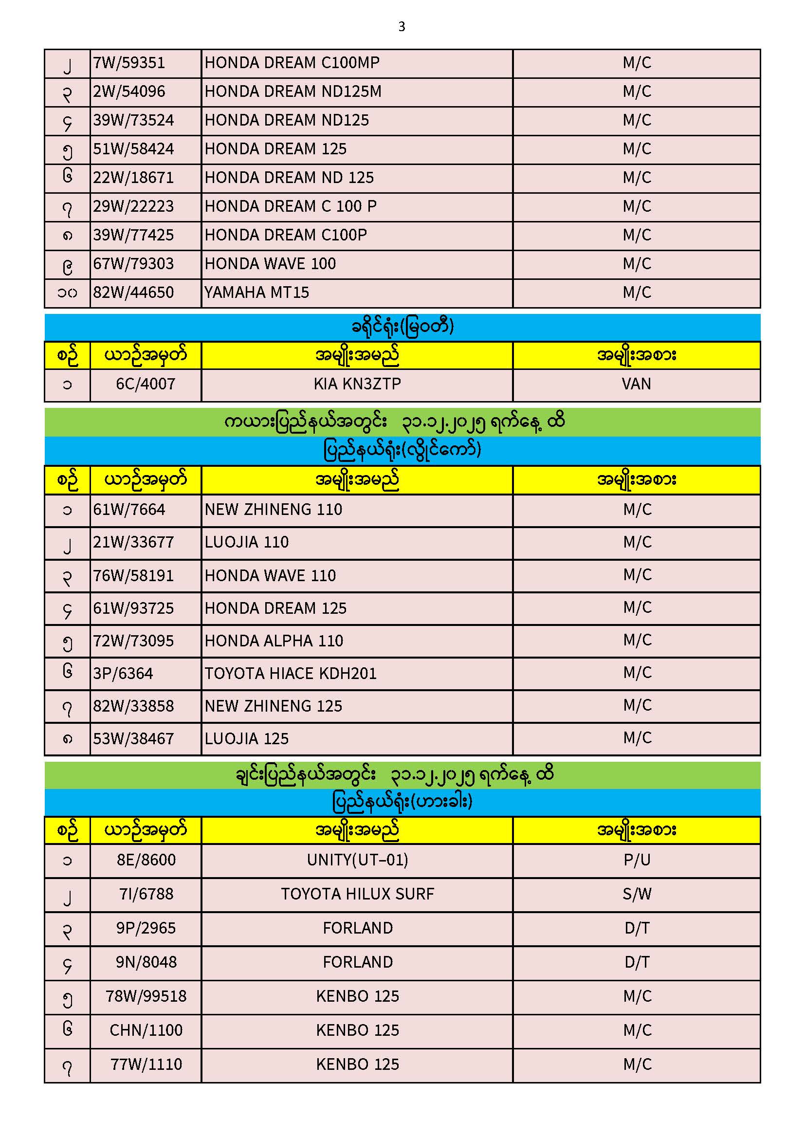 ၃၁.၁၂.၂၀၂၅ ရက်နေ့ထိ ယာဉ်မှတ်ပုံတင်စာအုပ်(ကမ-၃) ပျောက်ဆုံးမိတ္တူလာရောက် လျှောက်ထားသည့်စာရင်း