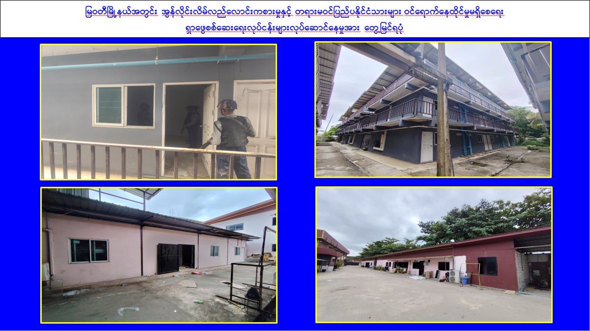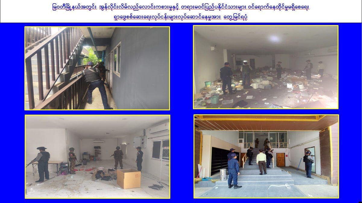 ထို့ပြင် ကရင်ပြည်နယ်၊ မြဝတီမြို့နှင့် ပတ်ဝန်းကျင်ဒေသတစ်ဝိုက်ရှိ အဆောက်အအုံများ၌ တရားမဝင်ပြည်ပနိုင်ငံသားများ ဝင်ရောက်နေထိုင်ခြင်းနှင့် အွန်လိုင်းလိမ်လည်လောင်းကစားမှုများ လုပ်ကိုင်ဆောင်ရွက်ခြင်းမရှိစေရေးအတွက် လုံခြုံရေးတပ်ဖွဲ့ဝင်များ၊ အုပ်ချုပ်ရေးအဖွဲ့အစည်းများနှင့် ဒေသတွင်းတာဝန်ရှိသူများအပါအဝင် အဖွဲ့စုံပါဝင်သည့် ပူးပေါင်းအဖွဲ့ဖြင့် ဒီဇင်ဘာ ၈ ရက်မှစတင်၍ ရှာဖွေရှင်းလင်းဆောင်ရွက်လျက်ရှိပြီး ယနေ့တွင်လည်း ၁ ထပ်အဆောက်အအုံ ၆ လုံး၊ ၂ ထပ်အဆောက်အအုံ ၄ လုံး၊ ၃ ထပ် အဆောက်အအုံ ၂၀ လုံးနှင့် ၄ ထပ်အဆောက်အအုံ ၆ လုံး စုစုပေါင်း အဆောက်အအုံ ၃၆ လုံးကို ရှာဖွေစစ်ဆေးရာ အွန်လိုင်းလိမ်လည်လောင်းကစားမှုလုပ်ကိုင်ခြင်းနှင့် တရားမဝင် ပြည်ပနိုင်ငံသားများ ဝင်ရောက်နေထိုင်ခြင်းများမရှိသည်ကို စစ်ဆေးတွေ့ရှိရကြောင်း သိရှိရသည်။