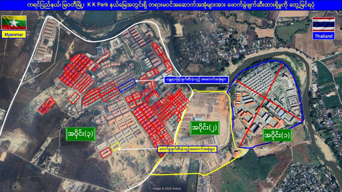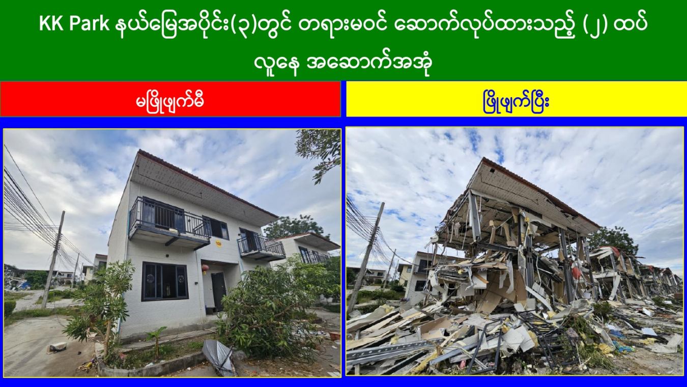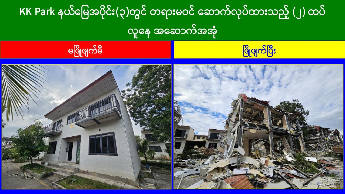 KK Park နယ်မြေအတွင်းရှိ အွန်လိုင်းလိမ်လည်လောင်းကစားမှုကျူးလွန်ရာတွင် အသုံးပြုသည့် အဆောက်အအုံ ၁၆ လုံး ထပ်မံဖြိုချဖျက်ဆီး၊ မြဝတီမြို့နယ်အတွင်း အွန်လိုင်းလိမ်လည်လောင်းကစားမှုများ ကျူးလွန်မှုမရှိစေရေး ဆက်လက်ရှာဖွေစစ်ဆေး