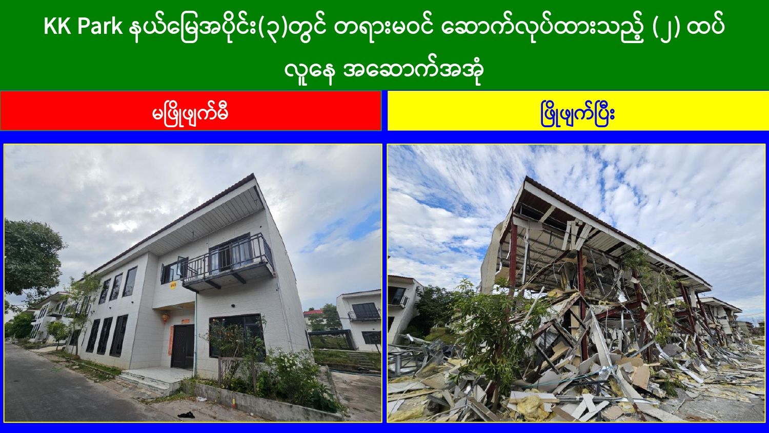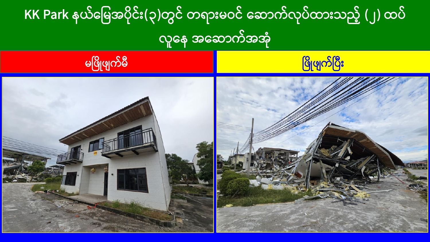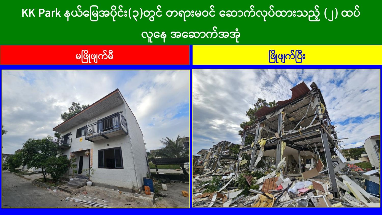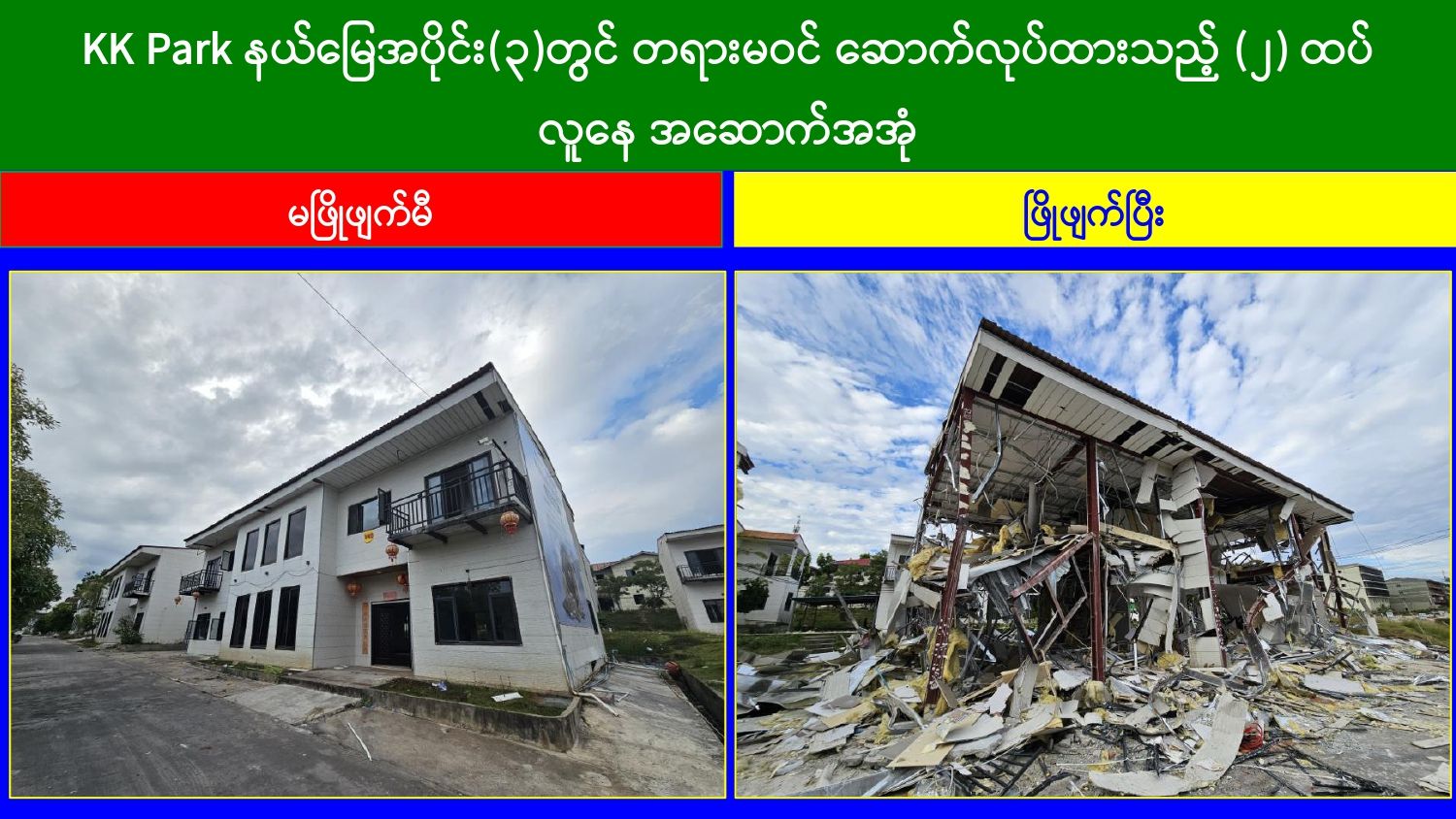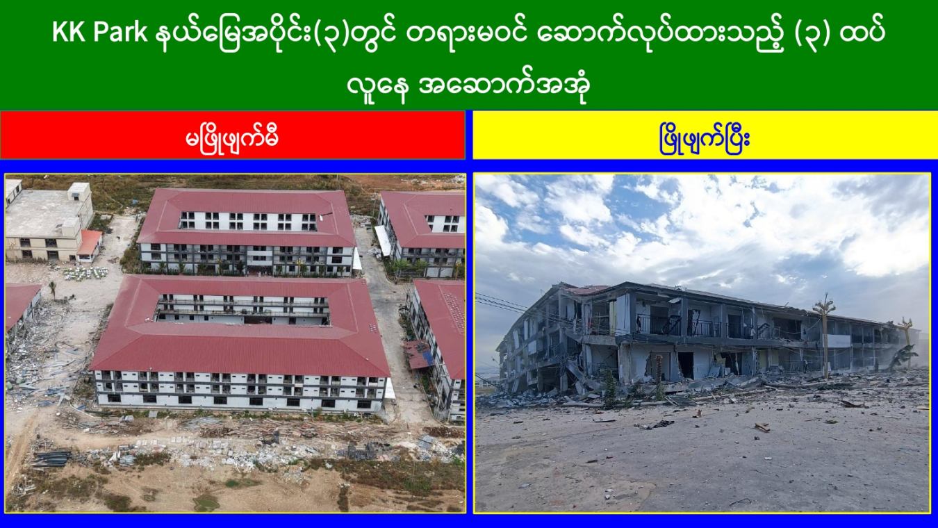 ထိုသို့ အွန်လိုင်းလိမ်လည်လောင်းကစားမှုတိုက်ဖျက်ရေးလုပ်ငန်းများ ဆောင်ရွက်လျက်ရှိရာ ယနေ့တွင် မြဝတီ-မဲထော်သလေး (KK Park) နယ်မြေအတွင်းရှိ အွန်လိုင်းလိမ်လည်လောင်းကစားမှုများ ကျူးလွန်ရာတွင် အသုံးပြုခဲ့သည့် အပိုင်း(၃) နယ်မြေအတွင်းရှိ တရားမဝင် ၃ ထပ်အဆောက်အအုံ ၁ လုံးနှင့် ၂ ထပ် အဆောက်အအုံ ၁၅ လုံး၊ စုစုပေါင်း တရားမဝင်အဆောက်အအုံ ၁၆ လုံးကို ထပ်မံဖြိုချဖျက်ဆီးခဲ့သဖြင့် KK Park နယ်မြေအတွင်းရှိ တရားမဝင် အဆောက်အအုံ စုစုပေါင်း ၆၃၅ လုံး အနက် ၄၂၉ လုံးကို စနစ်တကျ ဖြိုချဖျက်ဆီးပြီးဖြစ်ကြောင်း သိရှိရသည်။