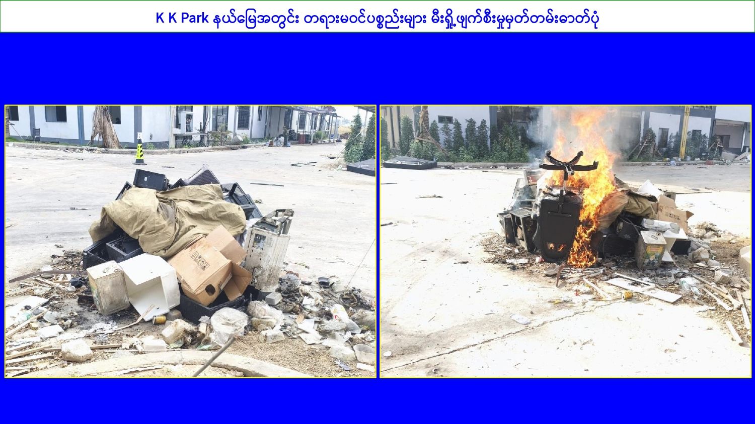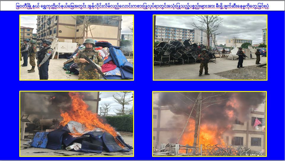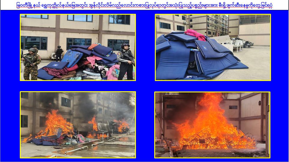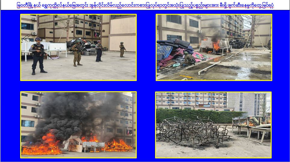 ၎င်းအပြင် မြဝတီမြို့နယ်အတွင်းရှိ KK Park နယ်မြေနှင့် ရွှေကုက္ကိုလ်နယ်မြေတို့၌ အွန်လိုင်းလိမ်လည်လောင်းကစားမှုကျူးလွန်ရာတွင် အသုံးပြုသည့်ပစ္စည်းများအား ထပ်မံ၍ အသုံးပြုနိုင်ခြင်းမရှိစေရန်အတွက် ယနေ့တွင်လည်း စနစ်တကျ မီးရှို့ဖျက်ဆီးခဲ့ကြောင်း သိရှိရသည်။