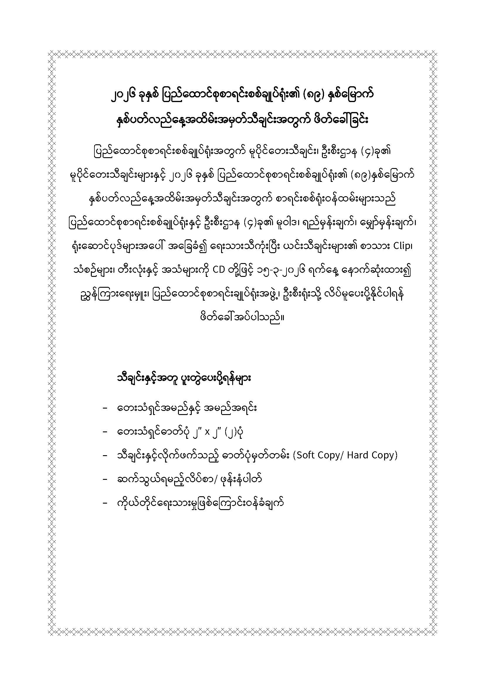 ကြော်ငြာစာအမှတ် (၂/၂၀၂၅)ပါ နိုင်ငံခြားရေးဝန်ကြီးဌာန၊ စီမံကိန်းနှင့်စီမံရေးရာဦးစီးဌာန၊ ဌာနစုမှူး(၂)/ တတိယအတွင်းဝန် (အမျိုးသား/အမျိုးသမီး) ရာထူး (၃၀) နေရာအတွက် စိတ်အခြေအနေနှင့် လူတွေ့စစ်ဆေးမှုခံယူမည့်သူများသတင်းပို့ရန်အတွက် အကြောင်းကြားစာနှင့် ရေးသွင်းရမည့်ပုံစံများကြေညာခြင်း