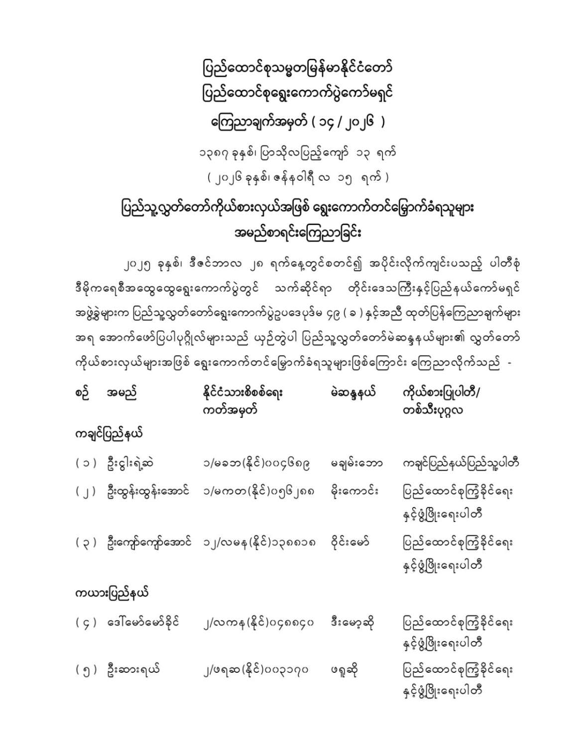 ပြည်သူ့လွှတ်တော်ကိုယ်စားလှယ်အဖြစ် ရွေးကောက်တင်မြှောက်ခံရသူများ အမည်စာရင်းကြေညာခြင်း