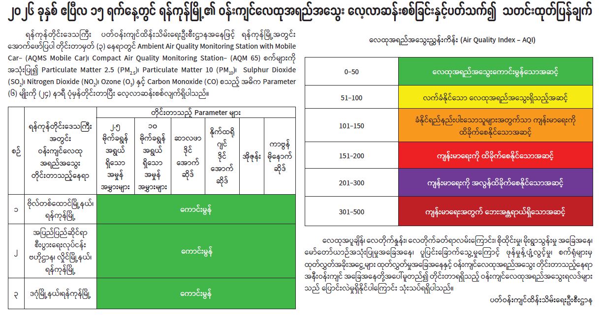 ၂၀၂၆ ခုနှစ် ဧပြီလ ၁၅ ရက်နေ့တွင် ရန်ကုန်မြို့၏ ဝန်းကျင်လေထုအရည်အသွေး လေ့လာဆန်းစစ်ခြင်းနှင့်ပတ်သက်၍ သတင်းထုတ်ပြန်ချက်