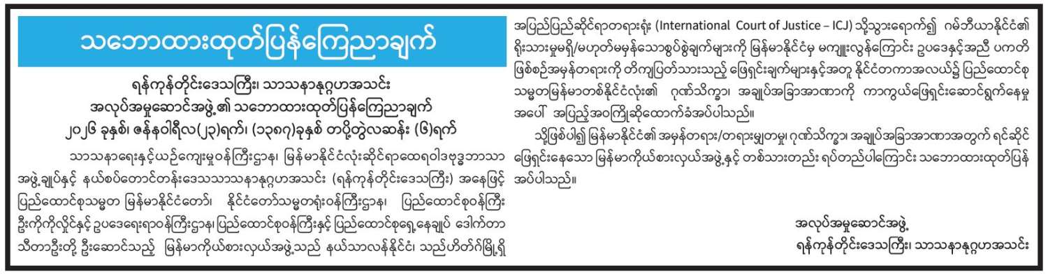 ရန်ကုန်တိုင်းဒေသကြီး၊ သာသနာနုဂ္ဂဟအသင်းအလုပ်အမှုဆောင်အဖွဲ့၏ သဘောထားထုတ်ပြန်ကြေညာချက်