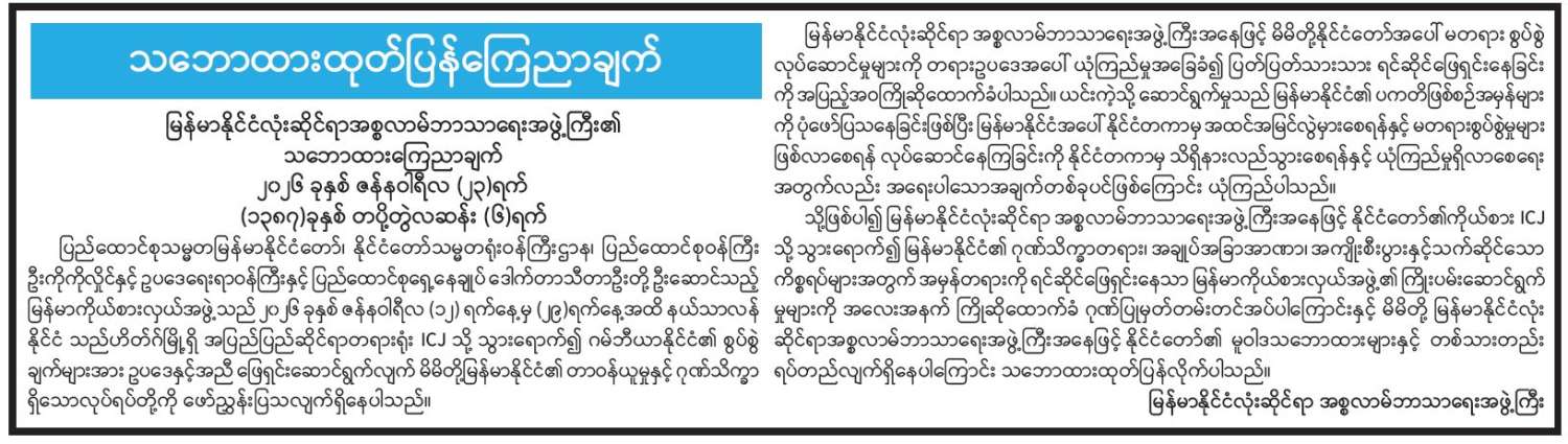 မြန်မာ-အိန္ဒိယချစ်ကြည်ရေးအသင်း (MIFA) ဗဟိုအလုပ်အမှုဆောင်အဖွဲ့၏ သဘောထားထုတ်ပြန်ကြေညာချက်