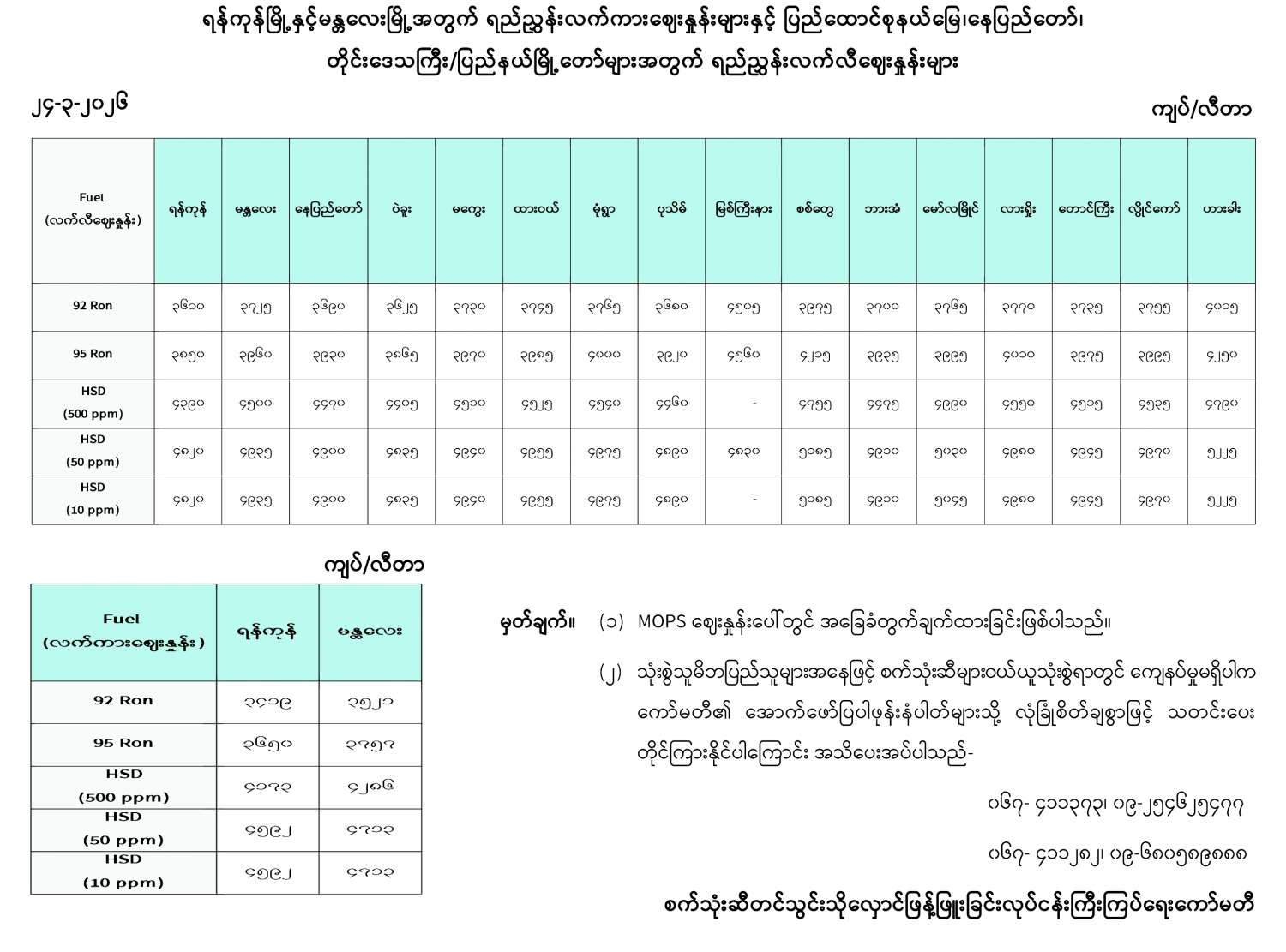 ရန်ကုန်မြို့နှင့် မန္တလေးမြို့အတွက် ရည်ညွှန်းလက်ကားဈေးနှုန်းများနှင့် ပြည်ထောင်စုနယ်မြေ နေပြည်‌တော်၊ တိုင်းဒေသကြီး/ပြည်နယ် မြို့တော်များအတွက် ရည်ညွှန်းလက်လီဈေးနှုန်းများ
