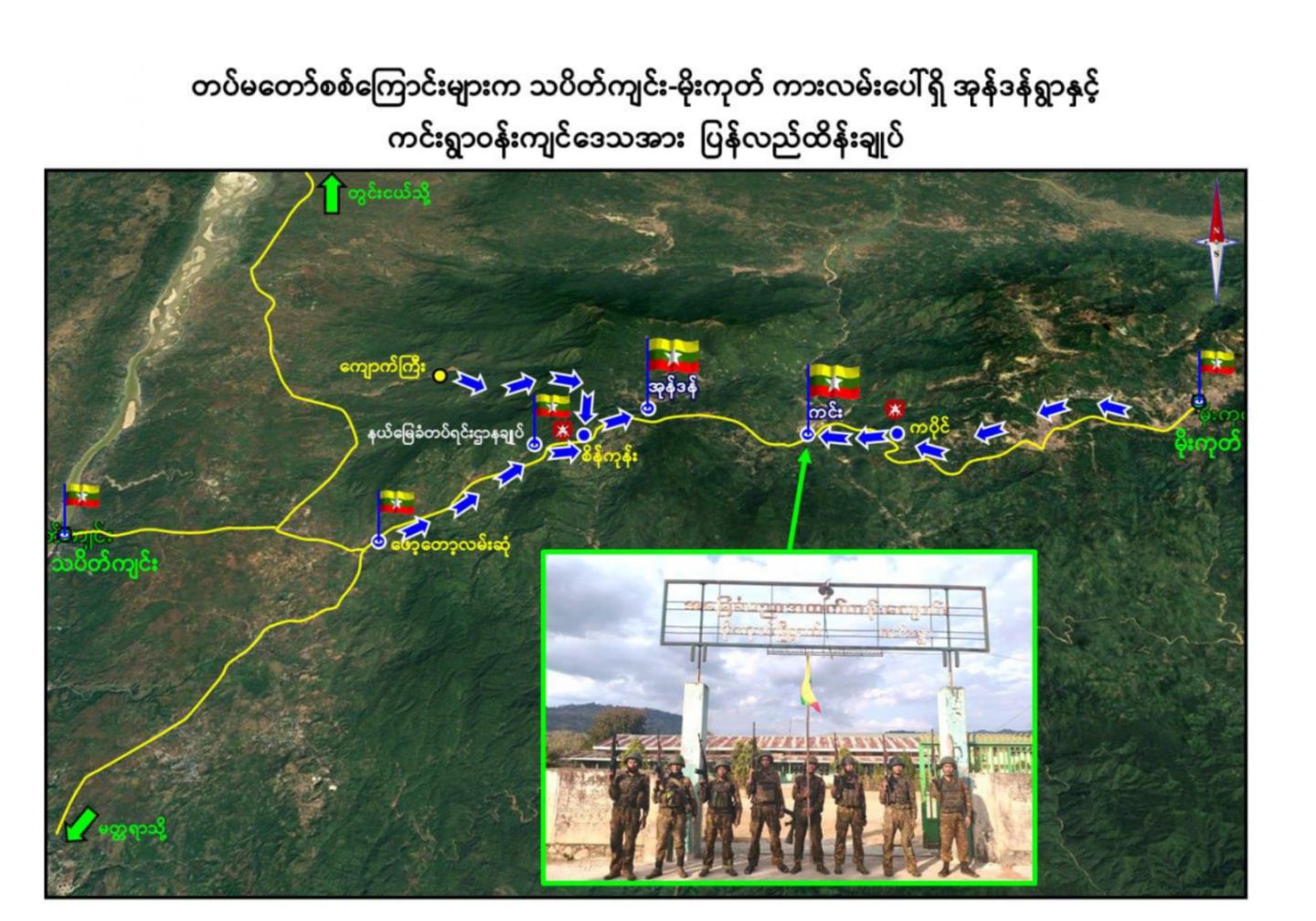 တပ်မတော်စစ်ကြောင်းများက မိုးကုတ် - သပိတ်ကျင်းလမ်းကြောင်းပေါ်ရှိ အကြမ်းဖက်သောင်းကျန်းသူများ ယာယီစိုးမိုးထားသည့် အုန်ဒန်ကျေးရွာ၊ ကင်းကျေးရွာနှင့် ရန်သူ့စခန်းတစ်ခုတို့အား ဆက်လက်သိမ်းပိုက်ရရှိ