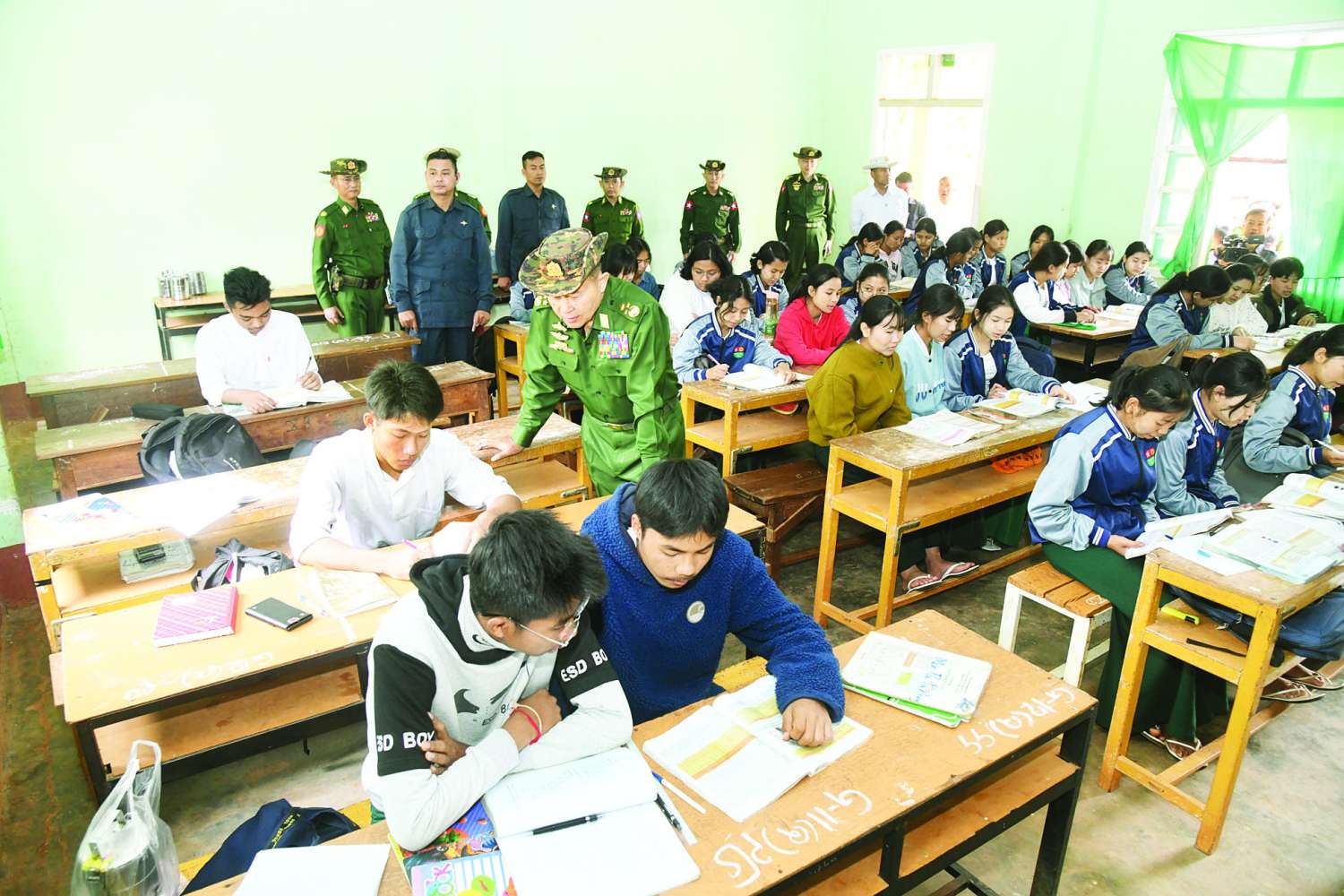 ဆက်လက်၍ နိုင်ငံတော်လုံခြုံရေးနှင့်အေးချမ်းသာယာရေးကော်မရှင် ဒုတိယဥက္ကဋ္ဌ ဒုတိယတပ်မတော်ကာကွယ်ရေးဦးစီးချုပ် ကာကွယ်ရေးဦးစီးချုပ် (ကြည်း) နှင့် အဖွဲ့ဝင်များသည် အမှတ် (၁) အခြေခံပညာအထက်တန်းကျောင်း (ဗထူး) သို့ သွားရောက်၍ ၂၀၂၆ ခုနှစ်၊ မတ်လတွင်ကျင်းပတော့မည့် Grade-12 စာမေးပွဲဝင်ရောက်ဖြေဆိုကြမည့် ကျောင်းသား၊ ကျောင်းသူများအား အနီးကပ်သင်ကြားပေးနေမှုများ သွားရောက်ကြည့်ရှုအားပေးစကားပြောကြားသည်။