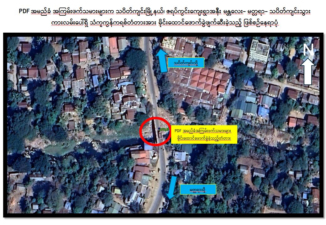 သပိတ်ကျင်းမြို့နယ်၊ ဇရပ်ကွင်းကျေးရွာအနီး မန္တလေး-မတ္တရာ-သပိတ်ကျင်းသွား ကားလမ်းပေါ်ရှိ သံကူကွန်ကရစ်တံတားအား PDF အမည်ခံ အကြမ်းဖက်သမားများက မိုင်းထောင်ဖောက်ခွဲဖျက်ဆီး