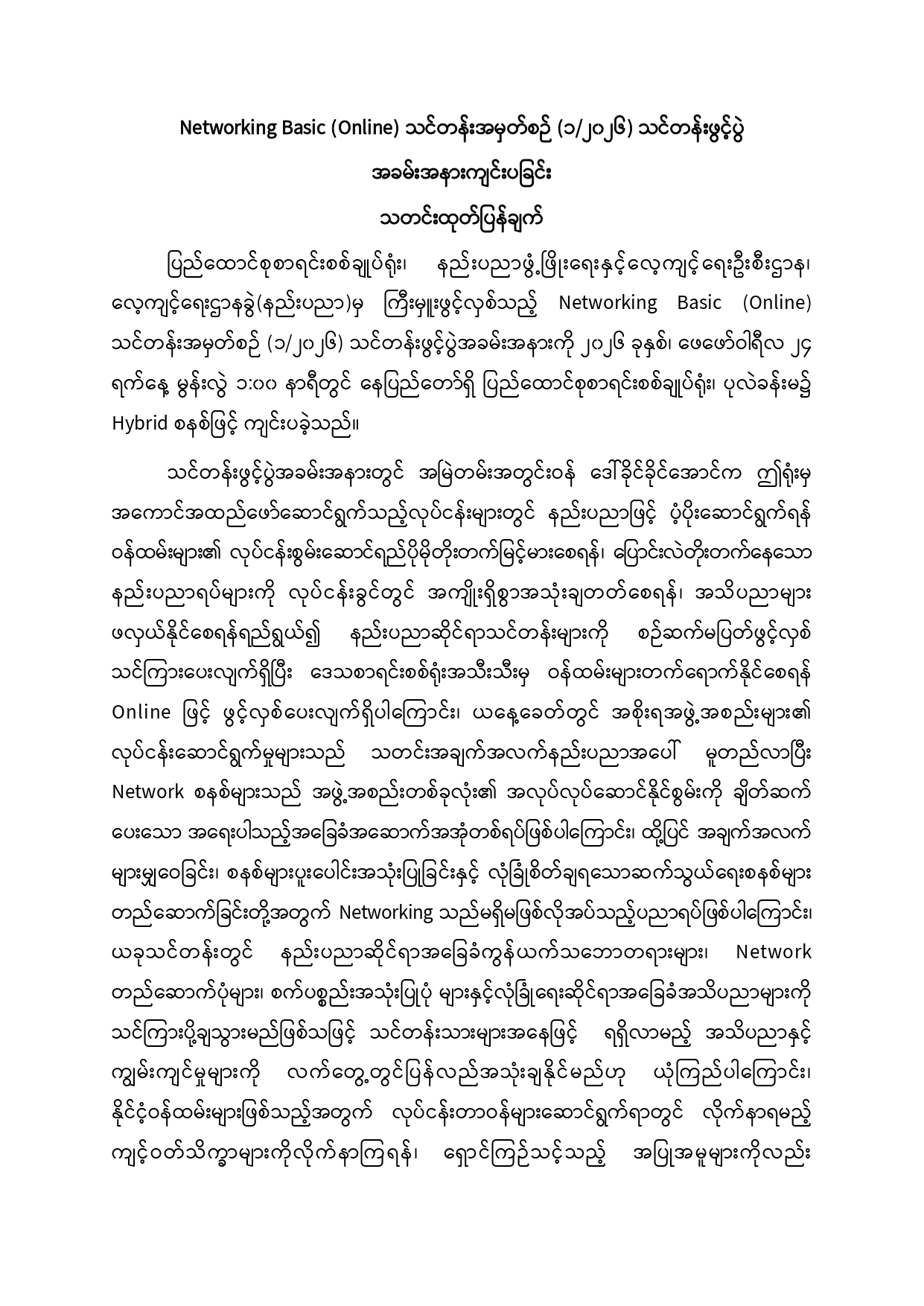 ပြည်ထောင်စုစာရင်းစစ်ချုပ်ရုံး၊ နည်းပညာဖွံ့ဖြိုးရေးနှင့်လေ့ကျင့်ရေးဦးစီးဌာန၊ လေ့ကျင့်ရေးဌာနခွဲ(နည်းပညာ)မှ ကြီးမှူးဖွင့်လှစ်သည့် Networking Basic (Online) သင်တန်းအမှတ်စဉ် (၁/၂၀၂၆) သင်တန်းဖွင့်ပွဲအခမ်းအနားကို ၂၀၂၆ ခုနှစ်၊ ဖေဖော်ဝါရီလ ၂၄ ရက်နေ့ မွန်းလွဲ ၁:၀၀ နာရီတွင် နေပြည်တော်ရှိ ပြည်ထောင်စုစာရင်းစစ်ချုပ်ရုံး၊ ပုလဲခန်းမ၌ Hybrid စနစ်ဖြင့် ကျင်းပခဲ့သည်။