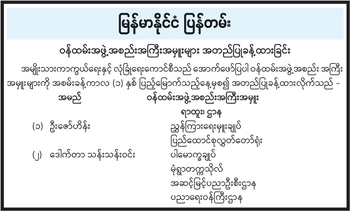 အမျိုးသားစီမံကိန်းဝန်ကြီးဌာန၊ ဗဟိုစက်ပစ္စည်းစာရင်းအင်းနှင့်စစ်ဆေးရေးဦးစီးဌာနမှ လစ်လပ်လျက်ရှိသော အမှုထမ်း(၂၈)နေရာ အတွက် အလုပ်လျှောက်လွှာခေါ်ယူခြင်း