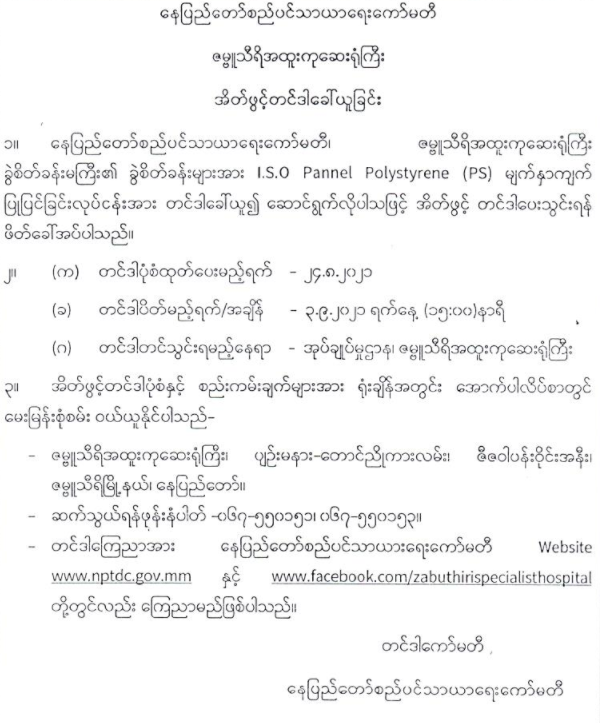 နေပြည်တော်စည်ပင်သာယာရေးကော်မတီ၊ ဇမ္ဗူသီရိအထူးကုဆေးရုံကြီးမှ အိတ်ဖွင့်တင်ဒါခေါ်ယူခြင်း