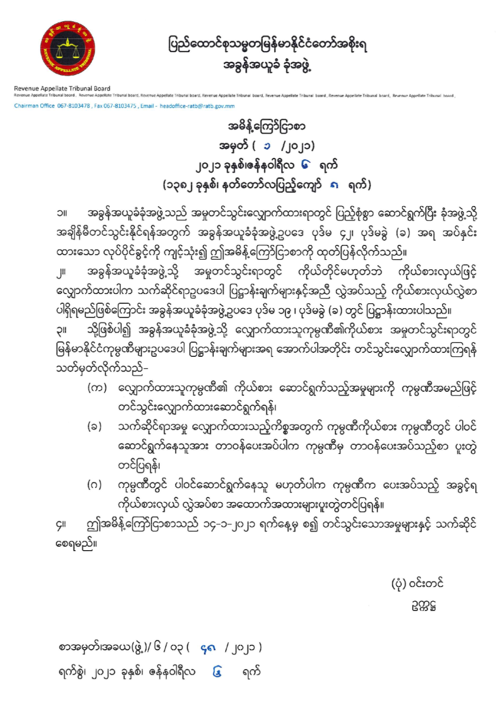 အခွန်အယူခံခုံအဖွဲ့ အမိန့်ကြော်ငြာစာအမှတ် ၁ / ၂၀၂၂
