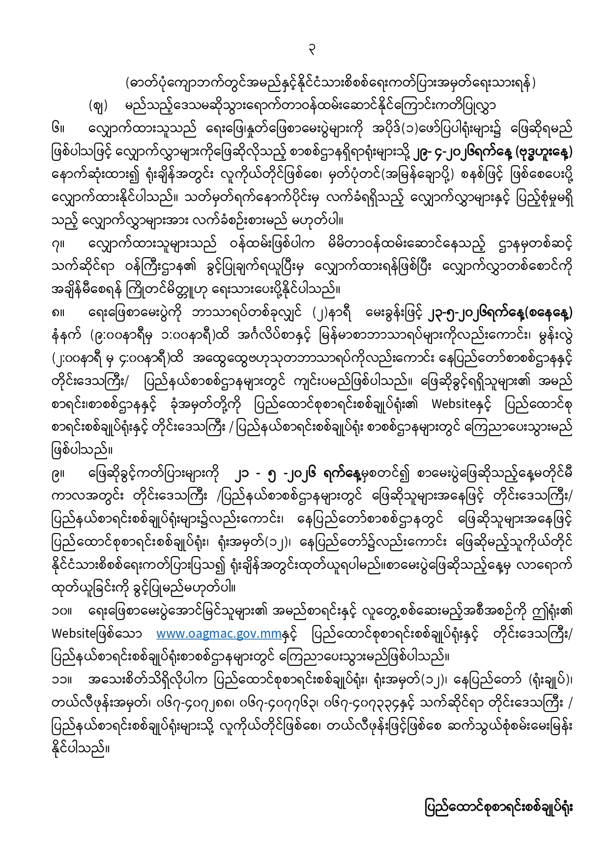 Posted on Mar 22, 2026၁။ အရှေ့အလယ်ပိုင်းပဋိပက္ခကြောင့် ဖြစ်ပေါ်လာနိုင်သည့် စက်သုံးဆီရှားပါးမှုကို ကြိုတင်ကာကွယ်ရန်ရည်ရွယ်၍ စုံ ၊ မ ယာဉ်သုံးစွဲသည့်စနစ်နှင့် စက်သုံးဆီဝယ်ယူသည့်စနစ်တို့ကို သတ်မှတ်ကြေညာခဲ့ပြီးဖြစ်ပါသည်။ ထိုသို့ သတ်မှတ်ကြေညာခဲ့သည့်နည်းတူ နိုင်ငံတော်အစိုးရအနေဖြင့်လည်း စက်သုံးဆီတင်သွင်းရရှိရေးကို နည်းလမ်းမျိုးစုံဖြင့် အတတ်နိုင်ဆုံး ကြိုးပမ်းဆောင်ရွက်လျက်ရှိပါသည်။ လက်ရှိတွင် လုံလောက်သော စက်သုံးဆီအရန်ရှိသော်လည်း အနာဂတ်တွင်ဖြစ်လာနိုင်သော စွမ်းအင်ဆိုင်ရာ စိန်ခေါ်မှုများအတွက် ကြိုတင်ပြင်ဆင်သည့်အနေဖြင့် စက်သုံးဆီသုံးစွဲမှုကို ချွေတာလျှော့ချရန်ရည်ရွယ်ကာ အစိုးရရုံးဌာနများမှ အရာထမ်း၊ အမှုထမ်းများသည် သက်ဆိုင်ရာရုံးဌာနများသို့သွားရောက်ခြင်းမပြုဘဲ မိမိနေထိုင်ရာ နေအိမ်၊ အဆောင်များတွင်သာ ရုံးလုပ်ငန်းဆောင်ရွက်ခြင်းအား ၂၀၂၆ ခုနှစ်၊ မတ်လ ၂၅ ရက်နေ့မှစတင်ပြီး အပတ်စဉ် ဗုဒ္ဒဟူးနေ့တိုင်းဆောင်ရွက်သွားကြရန် သတ်မှတ်ကြေညာလိုက်ပါသည်။ ထိုသို့ သတ်မှတ်ကြေညာခြင်းသည် စက်သုံးဆီချွေတာရန်ဖြစ်သည့်အားလျော်စွာ အစိုးရရုံးဌာနများမှ အရာထမ်း၊ အမှုထမ်းများအနေဖြင့် အဆိုပါရက်တွင် တာဝန်မှအပ ခရီးသွားလာမှုမပြုရန်နှင့် ယာဉ်သုံးစွဲမှုမပြုကြရန်ဖြစ်ပါသည်။