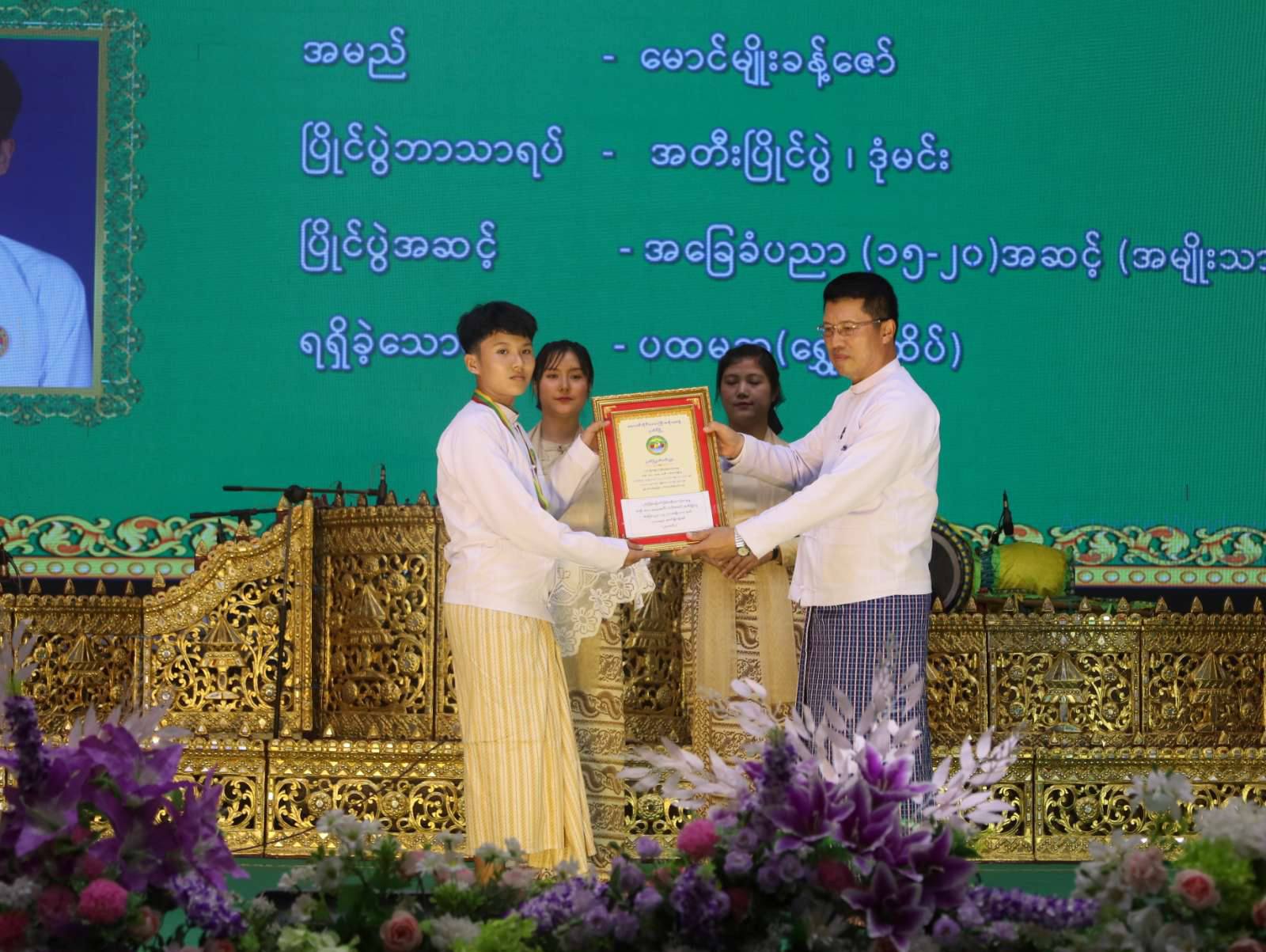 ထို့နောက် ဆုချီးမြှင့်ပွဲ အခမ်းအနားကိုဆက်လက်ပြုလုပ်ရာ အဆိုပြိုင်ပွဲတွင် အဆင့်မြင့်ပညအဆင့်(အမျိုးသား)၊ ခေတ်ဟောင်း တေး/ကာလပေါ်တွင် ပထမဆု (ရွှေတံဆိပ်)နှင့် အမျိုးဂုဏ်၊ ဇာတိဂုဏ်မြှင့်တင်ရေးတွင် တတိယဆု (ကြေး တံဆိပ်)ဆု၊ အတီးပြိုင်ပွဲ၊ အဆင့်မြင့်ပညာအဆင့် (အမျိုးသား)၊ ဆိုင်းတစ်ဦးချင်းတွင် ပထမဆု (ရွှေတံဆိပ်)၊ အတီးပြိုင်ပွဲ၊ အဆင့်မြင့် ပညာအဆင့် (အမျိုးသား)၊ နှဲ တွင် ပထမဆု (ရွှေတံဆိပ်)၊ အတီးပြိုင်ပွဲ၊ အခြေခံပညာ(၁၅-၂၀)အဆင့် (အမျိုးသား)၊ ဒုံမင်းတွင် ပထမဆု (ရွှေတံဆိပ်)၊ အတီးပြိုင်ပွဲ၊ အဆင့်မြင့်ပညာအဆင့် (အမျိုးသား)၊ အိုးစည် အဖွဲ့လိုက်တွင် ပထမဆု(ရွှေတံဆိပ်)၊ အတီးပြိုင်ပွဲ၊ အခြေခံပညာ (၁၀-၁၅)အဆင့် (အမျိုးသား)၊ ဆိုင်း တစ်ဦးချင်းတွင် ပထမဆု (ရွှေတံဆိပ်)ရရှိသူများနှင့် (၂၆)ကြိမ်မြောက် မြန်မာ့ရိုးရာယဉ်ကျေးမှု အဆို၊ အက၊ အရေး၊ အတီးပြိုင်ပွဲ၊ ဧရာဝတီတိုင်းဒေသကြီးကိုယ်စားပြု အသင်း အုပ်ချုပ်သူ/ ပံ့ပိုးသူများအား တိုင်းဒေသကြီးဝန်ကြီးချုပ်ကလည်းကောင်း၊ အဆိုပြိုင်ပွဲ၊ အခြေခံပညာ (၁၀-၁၅)အဆင့် (အမျိုးသမီး)၊ ခေတ်ဟောင်းတေး/ကာလပေါ်တွင် ပထမဆု(ရွှေတံဆိပ်)၊ အဆိုပြိုင်ပွဲ၊ မဟာဂီတတွင် ပထမဆု (ရွှေတံဆိပ်)၊ အဆိုပြိုင်ပွဲ၊ အခြေခံပညာ (၁၅-၂၀)အဆင့် (အမျိုးသမီး)၊ ခေတ်ဟောင်းတေး/ကာလပေါ်တွင် ပထမဆု (ရွှေတံဆိပ်)၊ အတီးပြိုင်ပွဲ၊ မယ်ဒလင်တွင် တတိယဆု (ကြေးတံဆိပ်)၊ အတီးပြိုင်ပွဲ၊ အခြေခံပညာ (၁၀-၁၅)အဆင့် (အမျိုးသမီး)၊ စောင်းတွင် ပထမဆု (ရွှေတံဆိပ်)၊ အတီးပြိုင်ပွဲ၊ အခြေခံ ပညာ (၁၅-၂၀)အဆင့်၊ စန္ဒရားတွင် တတိယဆု (ကြေး တံဆိပ်)၊ အတီးပြိုင်ပွဲ၊ အခြေခံပညာ (၁၀-၁၅)အဆင့် (အမျိုးသား) ဒုံမင်းတွင် ပထမဆု (ရွှေတံဆိပ်)၊ အတီးပြိုင်ပွဲ၊ အခြေခံပညာ (၁၅-၂၀) အဆင့်၊ ဆိုင်းတစ်ဦးချင်းတွင် တတိယဆု (ကြေးတံဆိပ်)၊ အတီးပြိုင်ပွဲ၊ အဆင့်မြင့်ပညာအဆင့် (အမျိုးသား)၊ ဒိုးပတ်အဖွဲ့လိုက်တွင် ပထမဆု (ရွှေတံဆိပ်)ဆုရရှိသူများနှင့် (၂၆)ကြိမ်မြောက် မြန်မာ့ရိုးရာယဉ်ကျေးမှု အဆို၊ အက၊ အရေး၊ အတီးပြိုင်ပွဲတွင် “တို့ဘိုးဘွားအမွေ ဧရာမြေ” သီချင်းဖြင့် ပါဝင် တင်ဆက်ခဲ့သော ဧရာဝတီတိုင်းဒေသကြီးကိုယ်စားပြု ကျေးလက် ရိုးရာအကအဖွဲ့အား တိုင်းဒေသကြီးဝန်ကြီးချုပ်၏ ဇနီးကလည်းကောင်း၊ အကပြိုင်ပွဲ၊ အခြေခံပညာ (၁၀-၁၅) အဆင့် (အမျိုးသား)၊ တစ်ဦးချင်းအကတွင် ဒုတိယဆု (ငွေတံဆိပ်)၊ အတီးပြိုင်ပွဲ၊ အဆင့်မြင့်ပညာအဆင့် (အမျိုးသား)၊ ပလွေတွင် ဒုတိယဆု (ငွေတံဆိပ်)၊ အတီးပြိုင်ပွဲ၊ အဆင့်မြင့်ပညာအဆင့် (အမျိုးသမီး)၊ မယ်ဒလင်တွင် ဒုတိယဆု (ငွေတံဆိပ်)၊ အတီးပြိုင်ပွဲ၊ အခြေခံပညာ (၁၀-၁၅)အဆင့် (အမျိုးသမီး)၊ ဒုံမင်းတွင် ဒုတိယဆု (ငွေတံဆိပ်)ဆုရရှိသူများအား ပုသိမ်လေတပ်စခန်းဌာနချုပ်မှူးကလည်းကောင်း၊ အတီးပြိုင်ပွ