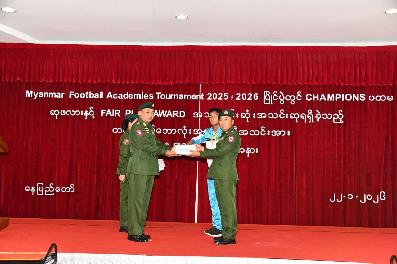 Myanmar Football Academies Tournament 2025-2026 ပြိုင်ပွဲတွင် ပထမဆုနှင့် အသန့်ရှင်းဆုံးအသင်းဆု (Fair Play Award) ရရှိခဲ့သည့် တပ်မတော်ဘောလုံးအကယ်ဒမီ အသင်းအား ဂုဏ်ပြုချီးမြှင့်ခြင်းအခမ်းအနားကို ယနေ့မွန်းလွဲပိုင်းတွင် နေပြည်တော်၊ ဇေယျာသီရိဘောလုံးအားကစားကွင်း၌ ကျင်းပရာ တပ်မတော်အားကစားနှင့်ကာယပညာအုပ်ချုပ်ရေးကော်မတီဥက္ကဋ္ဌ စစ်ရေးချုပ် ဒုတိယဗိုလ်ချုပ်ကြီး ဇော်ဟိန်း၊ တပ်မတော်ဘောလုံးကော်မတီဥက္ကဋ္ဌ ဗိုလ်ချုပ် ရဲထွဋ်၊ ကာကွယ်ရေးဦးစီးချုပ်ရုံး (ကြည်း) မှ တပ်မတော် အရာရှိကြီးများ၊ တပ်မတော်ဘောလုံးအကယ်ဒမီအုပ်ချုပ်ရေးမှူး၊ Myanmar Football Academies Tournament 2025-2026 ပြိုင်ပွဲတွင် ပထမဆုနှင့် အသန့်ရှင်းဆုံးအသင်းဆု (Fair Play Award )ရရှိခဲ့သည့် တပ်မတော်ဘောလုံးအကယ်ဒမီအသင်းမှ နည်းပြအဖွဲ့ဝင်များ၊ အားကစားသမားများနှင့် တာဝန်ရှိသူများ တက်ရောက်ကြသည်။