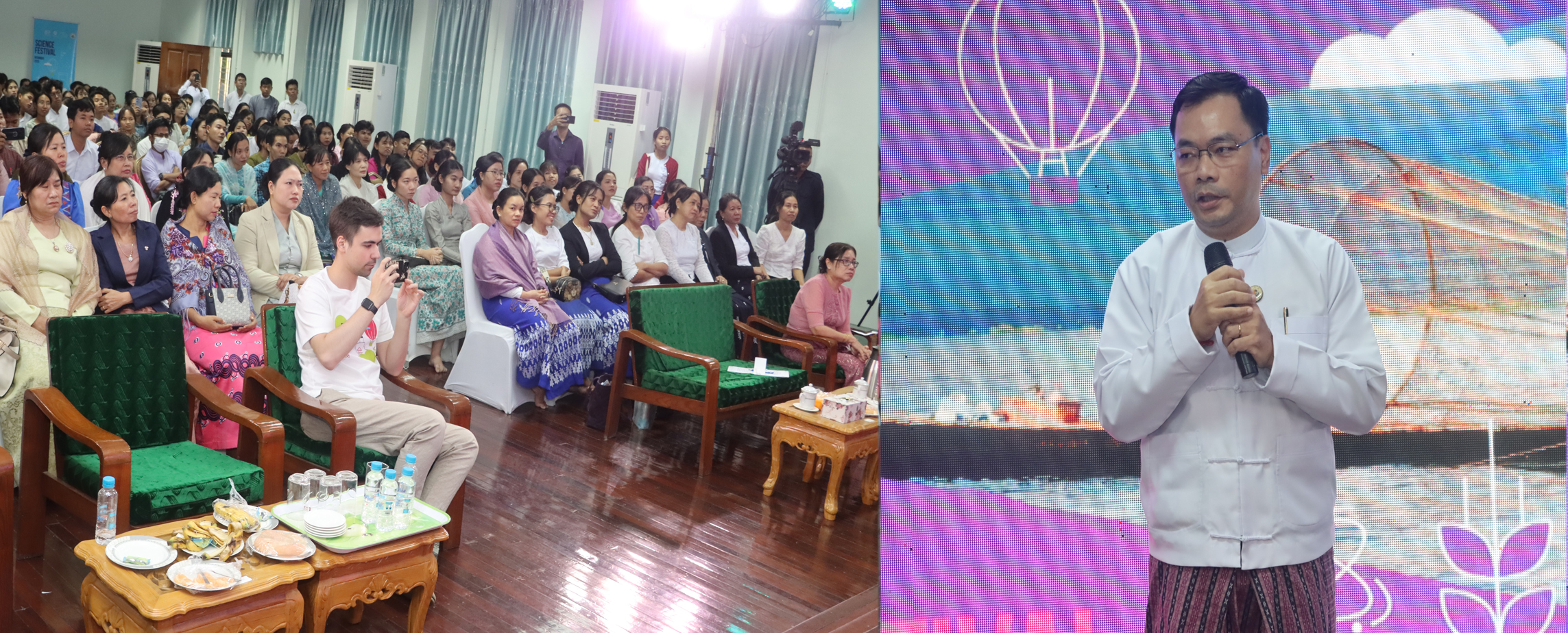 ရုရှားဖက်ဒရေးရှင်းနိုင်ငံ နိုင်ငံပိုင်အဏုမြူစွမ်းအင်ကော်ပိုရေးရှင်းအေဂျင်စီ (ROSATOM) နှင့် သိပ္ပံနှင့်နည်းပညာဝန်ကြီးဌာနတို့ ပူးပေါင်းစီစဥ်သော သိပ္ပံပွဲတော် ၂၀၂၅ (Science Festival 2025) တတိယနေ့ကို ယနေ့တွင် ရန်ကုန်မြို့ရှိ နျူကလီးယားနည်းပညာသတင်းအချက်အလက်စင်တာနှင့် ရန်ကုန်နည်းပညာတက္ကသိုလ်တို့တွင် ကျင်းပရာ သိပ္ပံနှင့်နည်းပညာဝန်ကြီးဌာန ဒုတိယဝန်ကြီး ဒေါက်တာအောင်ဇေယျ၊ အဏုမြူစွမ်းအင်ဦးစီးဌာနနှင့် အဆင့်မြင့်သိပ္ပံနှင့်နည်းပညာဦးစီးဌာနတို့မှ ညွှန်ကြားရေးမှူးချုပ်များ၊ ROSATOM နှင့် ရုရှားနိုင်ငံ National Research Nuclear University MEPhI (Moscow Engineering Physics Institute) တို့မှ တာဝန်ရှိသူများနှင့် ပါမောက္ခများ၊ ပညာရေးဝန်ကြီးဌာန နှင့် သိပ္ပံနှင့်နည်းပညာဝန်ကြီးဌာနတို့ရှိ တက္ကသိုလ်၊ ကောလိပ်နှင့် အခြေခံကျောင်းများမှ ပါမောက္ခများ၊ သုတေသီများ၊ ဆရာ၊ ဆရာမများ၊ ကျောင်းသား၊ ကျောင်းသူများနှင့် ဖိတ်ကြားထားသည့် ဧည့်သည်တော်များ ပေါင်း ၂၅၀ ဦးခန့် တက်ရောက်ကြသည်။
