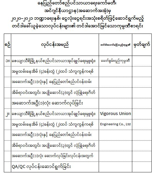 နေပြည်တော်စည်ပင်သာယာရေးကော်မတီ၊ အင်ဂျင်နီယာဌာန(အဆောက်အအုံ)မှ ၂၀၂၀-၂၀၂၁ဘဏ္ဍာရေးအတွက်တင်ဒါခေါ်ယူခဲ့သောလုပ်ငန်းများ၏ တင်ဒါအောင်မြင်သောကုမ္ပဏီစာရင်း အသိပေးအကြောင်းကြားခြင်း