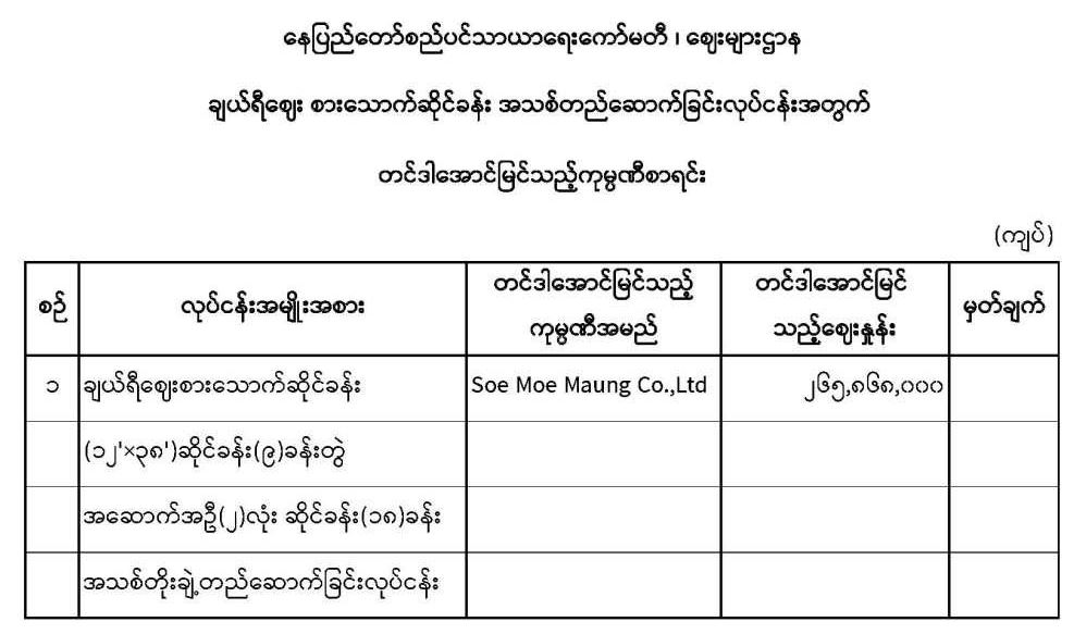 နေပြည်တော်စည်ပင်သာယာရေးကော်မတီ၊ ဈေးများဌာနမှ တင်ဒါအောင်မြင်သည့်ကုမ္ပဏီစာရင်း အသိပေးအကြောင်းကြားခြင်း