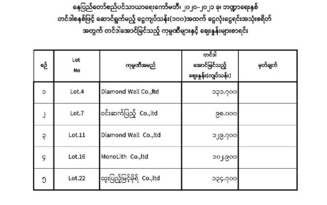 နေပြည်တော်စည်ပင်သာယာရေးကော်မတီ၊ ဈေးများဌာနမှ ၂၀၂၀-၂၀၂၁ခု ဘဏ္ဍာရေးနှစ် တင်ဒါစနစ်ဖြင့်ဆောင်ရွက်မည့် ငွေကျပ်သန်း(၁၀၀)အောက် လုပ်ငန်းများအတွက် တင်ဒါအောင်မြင်သည့်ကုမ္ပဏီစာရင်း အသိပေးအကြောင်းကြားခြင်း