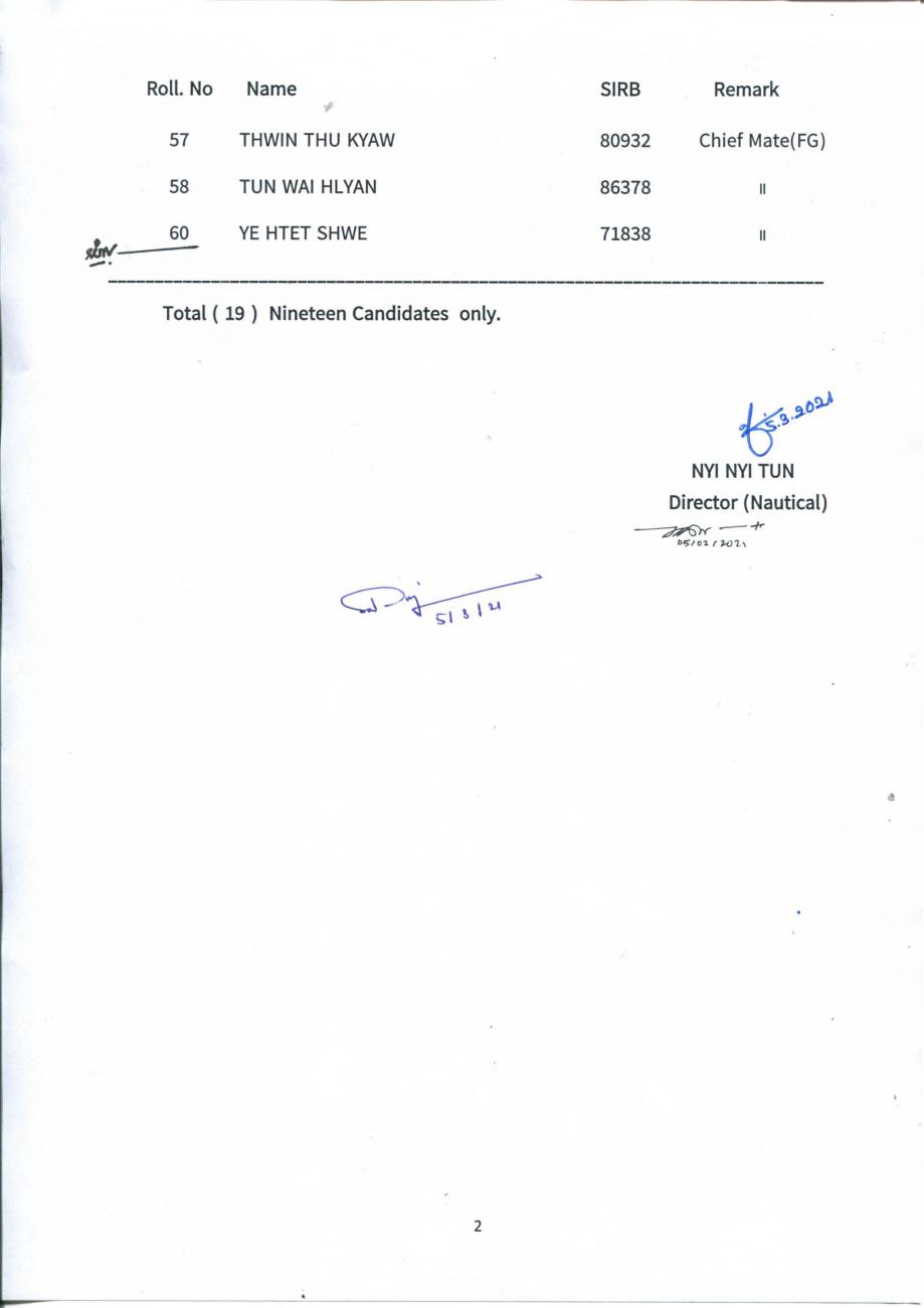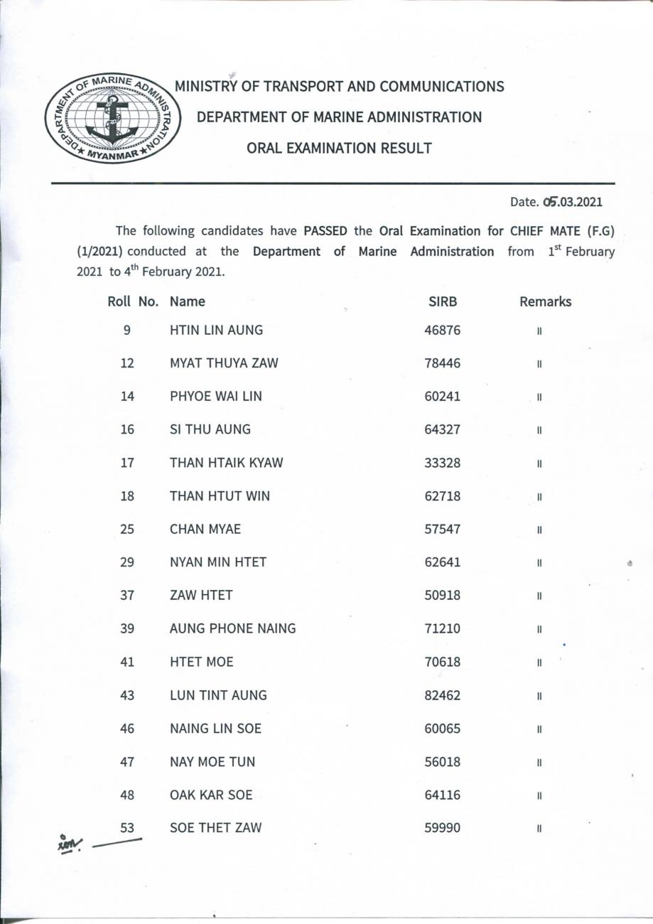 ရေကြောင်းပို့ဆောင်ရေးညွှန်ကြားမှုဦးစီးဌာန၊ ရေကြောင်းဌာနခွဲမှ Results of Oral Examination for Chief Mate (F.G) (1/2021) ထုတ်ပြန်ခြင်း