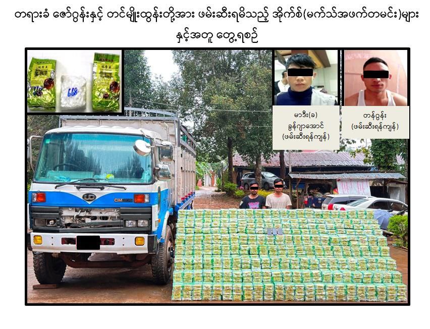 မူးယစ်ဆေးဝါးတားဆီးနှိမ်နင်းရေးရဲတပ်ဖွဲ့မှ တပ်ဖွဲ့ဝင်များပါဝင်သော ပူးပေါင်းအဖွဲ့သည် နိုဝင်ဘာလ ၁၆ ရက်နေ့ ည ၆ နာရီအချိန် လွိုင်လင်မြို့၊ ရပ်ကွက် (၂)၊ လွိုင်လင်-တောင်ကြီးသွား ကားလမ်းတွင် ပဲခူးတိုင်းဒေသကြီး၊ ထန်းတပင်မြို့နယ်၊ ကျီတော်ရွာနေ တင်မျိုးထွန်း (၄၂) နှစ် မောင်းနှင်ပြီး ရှမ်းပြည်နယ် (မြောက်ပိုင်း)၊ လားရှိုးမြို့နယ်၊ နားဖရွာနေ ဇော်ဂွန်း (၂၈)နှစ် လိုက်ပါလာသော NISSAN ၆ ဘီး မော်တော်ယာဉ်အား သတင်းအရ စစ်ဆေးရှာဖွေခဲ့ရာ ယာဉ်ပေါ်မှ အိုက်စ် (မက်သ်အဖက်တမင်း) ၁ ဒဿမ ၁၁၇ တန် (၎င်းဒေသ တန်ဖိုးငွေကျပ် ၁၅ ဒသမ ၆၃၈ ဘီလီယံ) ဖမ်းဆီးရမိခဲ့ကြောင်း၊ စစ်ဆေးဖော်ထုတ်ချက်အရ ဖမ်းဆီးရမိအိုက်စ် (မက်သ်အဖက် တမင်း) များအား သယ်ဆောင်ခိုင်းသူမှာ လားရှိုးမြို့နေ မာဒီး (ခ) ဂွန်ဂျာအောင် (ဖမ်းဆီးရန်ကျန်) နှင့် ကွတ်ခိုင်မြို့နယ်၊ ကောင်းခါးကျေးရွာနေ တန်ဂွန်း (ဖမ်းဆီးရန်ကျန်) တို့ဖြစ်ပြီး မိုင်းရယ်မှ ရန်ကုန်သို့ သယ်ဆောင်ရောင်းဝယ်ခြင်းဖြစ်ကြောင်း သိရှိရသဖြင့် ၎င်းတို့အား မူးယစ်ဆေးဝါးနှင့် စိတ်ကိုပြောင်းလဲစေသောဆေးဝါးများဆိုင်ရာ ဥပဒေအရ အရေးယူထားရှိပြီး ကွင်းဆက်ပြစ်မှုကျူးလွန်သူများအား ဆက်လက်ဖော်ထုတ်လျက်ရှိကြောင်း မြန်မာနိုင်ငံရဲတပ်ဖွဲ့မှ သတင်းရရှိသည်။