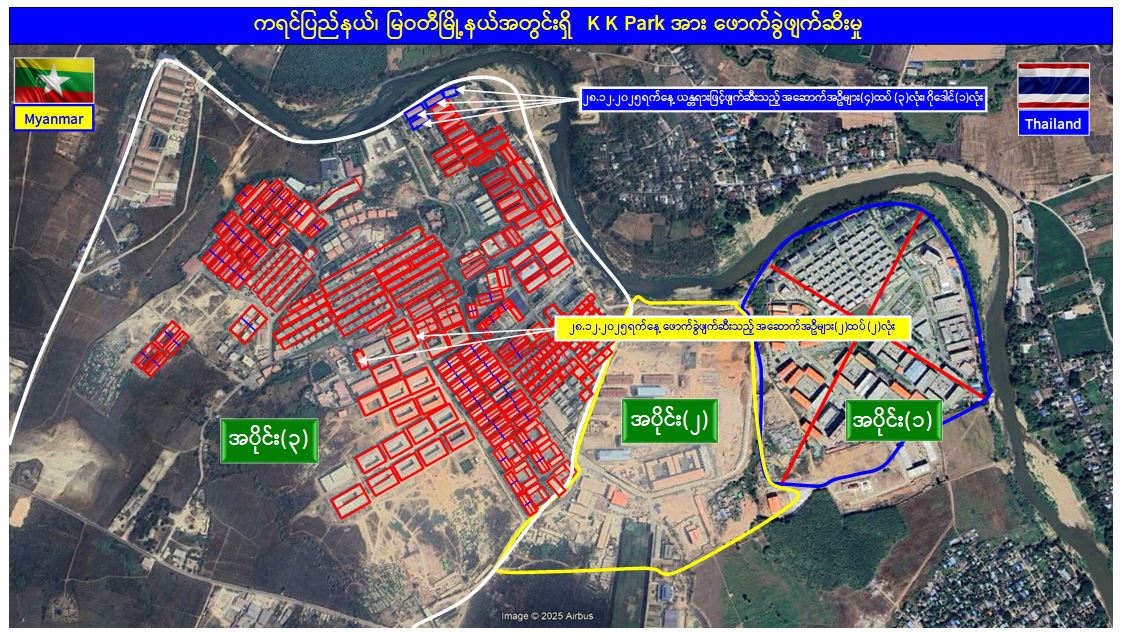 မြန်မာနိုင်ငံအစိုးရအနေဖြင့် အွန်လိုင်းလိမ်လည်လောင်းကစားမှုများ အများဆုံးအခြေချလုပ်ကိုင်လျက်ရှိကြသည့် ရွှေကုက္ကိုလ်နယ်မြေနှင့် KK Park နယ်မြေများရှိ တရားမဝင်အဆောက်အအုံများအတွင်း ဝင်ရောက်ရှင်းလင်းခြင်း၊ အွန်လိုင်းလိမ်လည် လောင်းကစားမှုလုပ်ငန်းစဉ်များတွင် အသုံးပြုခဲ့သည့် သိမ်းဆည်းရမိပစ္စည်းများနှင့် တရားမဝင်အဆောက်အအုံများအား စနစ်တကျဖြိုချဖျက်ဆီးခြင်းများကို လုံခြုံရေးတပ်ဖွဲ့ဝင်များ၊ အုပ်ချုပ်ရေးအဖွဲ့အစည်းများနှင့် ဒေသတွင်းတာဝန်ရှိသူများအပါအဝင် အဖွဲ့စုံပါဝင်သည့် ပူးပေါင်းအဖွဲ့ဖြင့် ဆောင်ရွက်လျက်ရှိရာ ယနေ့တွင် KK Park နယ်မြေအတွင်းရှိ တရားမဝင်အဆောက်အအုံ ၆ လုံးကို ထပ်မံဖြိုချဖျက်ဆီးခဲ့ကြောင်း သိရှိရသည်။