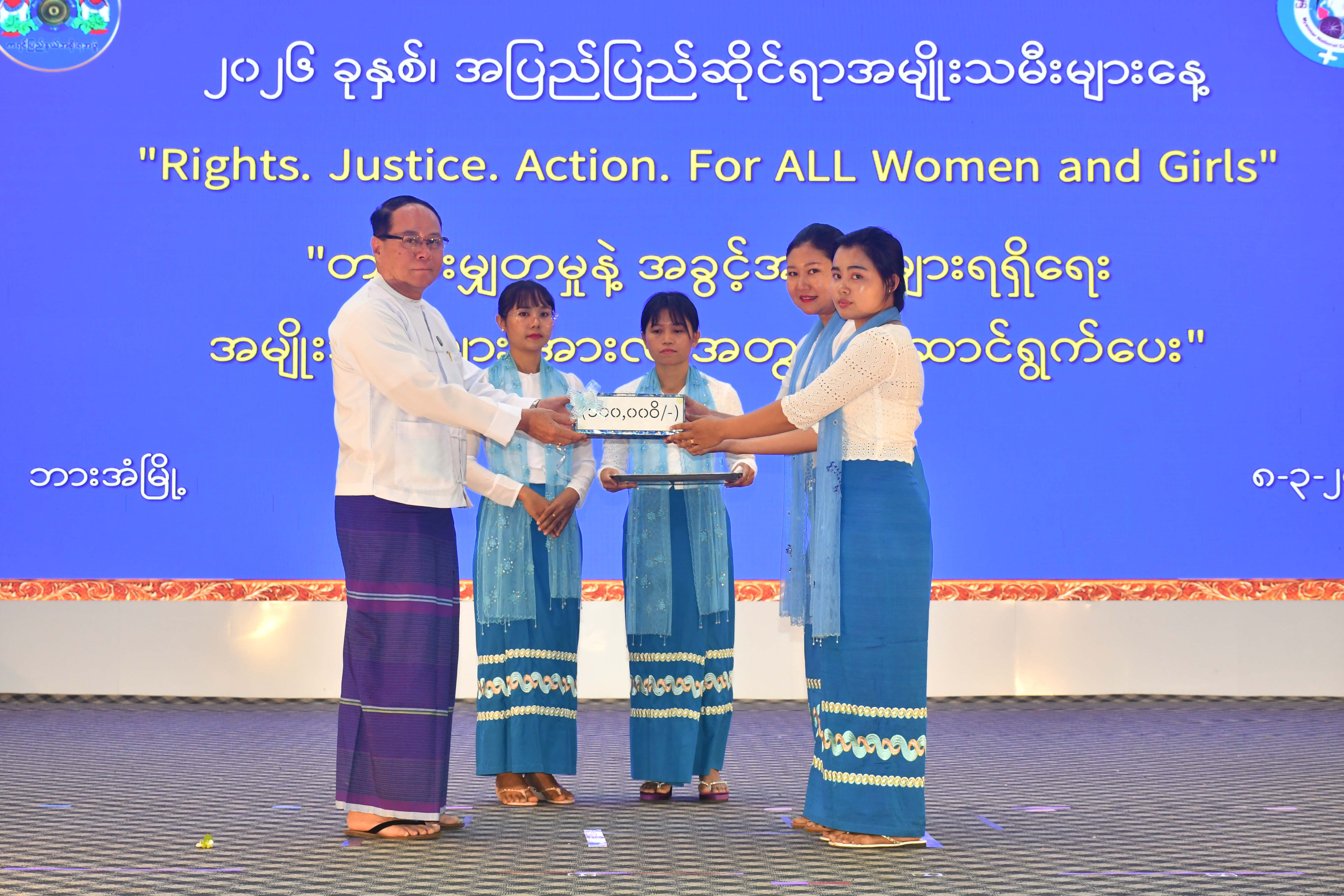 ထို့နောက် ပြည်နယ်ဝန်ကြီးချုပ်၊ ပြည်နယ်အမျိုးသမီးရေးရာအဖွဲ့နှင့် မိခင်နှင့်ကလေးစောင့်ရှောက်မှုကြီးကြပ်ရေး အဖွဲ့နာယက၊ ပြည်နယ်တရားလွှတ်တော်တရားသူကြီးချုပ်၊ ပြည်နယ်ဝန်ကြီးများ၊ အမျိုးသမီးများအရေးဆောင်ရွက်နေ သည့် အသင်းအဖွဲ့များနှင့်တက်ရောက်လာကြသူများက ကုလသမဂ္ဂအထွေထွေအတွင်းရေးမှူးချုပ်မှပေးပို့သော သဝဏ် လွှာ Video Clip နှင့် အပြည်ပြည်ဆိုင်ရာအမျိုးသမီးများနေ့အထိမ်းအမှတ် မြန်မာနိုင်ငံအမျိုးသမီးများဖွံ့ဖြိုးတိုးတက်ရေး ဆိုင်ရာဆောင်ရွက်ချက် Video Clip တို့ကို ကြည့်ရှုခဲ့ကြပြီး မူလတန်ကြိုကျောင်းများမှ ရင်သွေးငယ်လေးများက ကပြဖျော် ဖြေကြရာ ပြည်နယ်ဝန်ကြီးချုပ်၊ ပြည်နယ်အမျိုးသမီးရေးရာအဖွဲ့နှင့် မိခင်နှင့်ကလေးစောင့်ရှောက်မှုကြီးကြပ်ရေးအဖွဲ့ နာယက တို့က ဂုဏ်ပြုဆုငွေများပေးအပ်ချီးမြှင့်ကြသည်။