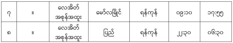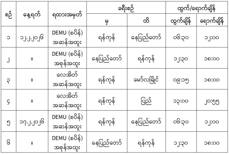 ပို့ဆောင်ရေးနှင့်ဆက်သွယ်ရေးဝန်ကြီးဌာန မြန်မာ့မီးရထားသည် ရထားစီးခရီးသွားပြည်သူများ ပိုမိုစိတ်ချမ်းမြေ့စွာသွားလာနိုင်ရန်အတွက် ရန်ကုန်-နေပြည်တော်လမ်းပိုင်း၌ ခေတ်မီလေအေးပေးစက်ပါ DEMU တွဲဆိုင်းသစ်များဖြင့်လည်းကောင်း၊ ရန်ကုန်-ပြည်နှင့် ရန်ကုန်-မော်လမြိုင်လမ်းပိုင်းတို့တွင် လေအိတ်ရထားတွဲဆိုင်းများဖြင့် လည်းကောင်း နေ့စဉ်ပုံမှန်ပြေးဆွဲပေးလျက်ရှိရာ ခရီးသည်များကြိုက်နှစ်သက်ကြပြီး စီးနင်းမှုများပြားသဖြင့် ပြည်ထောင်စုနေ့နှင့် တရုတ်နှစ်သစ်ကူး ရုံးပိတ်ရက် ကာလအတွင်း ခရီးသွားပြည်သူများနှင့် ဌာနဆိုင်ရာဝန်ထမ်းများ အဆင်ပြေစွာခရီးသွားလာနိုင်စေရေးအတွက် ရန်ကုန်-နေပြည်တော်-ရန်ကုန်၊ ရန်ကုန်-မော်လမြိုင်-ရန်ကုန်နှင့် ရန်ကုန်-ပြည်-ရန်ကုန် ခရီးစဉ်များကို ပုံမှန်ရထားများအပြင် အထူးရထား များကို အောက်ပါနေ့ရက်များအတိုင်း တိုးချဲ့ပြေးဆွဲပေးသွားမည်ဖြစ်သည်။