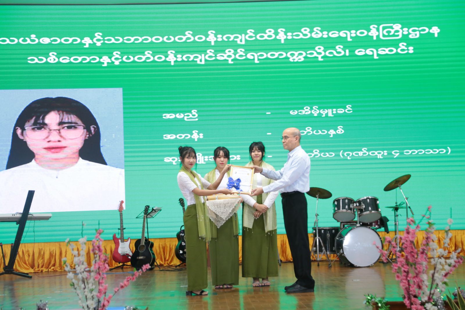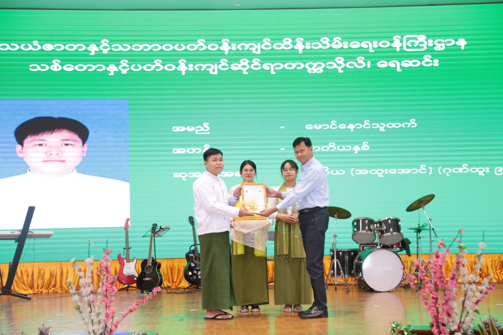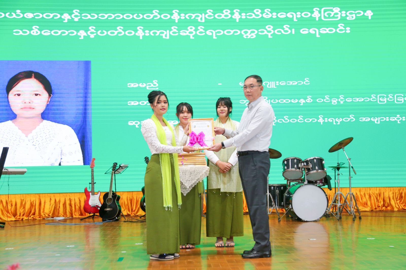 ထို့နောက် ဆုချီးမြှင့်ခြင်း အစီအစဉ်အား ဆက်လက်ကျင်းပရာ ပြည်ထောင်စုဝန်ကြီးက ပထမနှစ်မှ ပဉ္စမနှစ်အထိ ပညာရည်ထူးချွန် ပထမဆုရ ကျောင်းသား ကျောင်းသူများအား လည်းကောင်း၊ ဒုတိယဝန်ကြီးနှင့် အမြဲတမ်းအတွင်းဝန်တို့က ဒုတိယဆုနှင့် တတိယဆုရ ကျောင်းသား ကျောင်းသူများအား လည်းကောင်း ထူးချွန်ဆုများ အသီးသီး ချီးမြှင့်ပေးအပ်ပြီး ကျောင်းသား ကျောင်းသူများ၏ အဆို၊ အက၊ တေးသရုပ်ဖော်တို့ဖြင့် သီဆိုကပြဖျော်ဖြေမှုအား ကြည့်ရှု အားပေးခဲ့သည်။