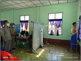 အကျဉ်းဦးစီးဌာနကွပ်ကဲမှုအောက်ရှိ အကျဉ်းထောင်/စခန်းအသီးသီးတွင် ကျန်းမာရေးဦးစီးဌာနနှင့် ပြင်ပကျန်းမာရေးအဖွဲ့များပူးပေါင်း၍ လစဉ် ကျန်းမာရေးစစ်ဆေးကုသပေးလျက်ရှိရာ ၂၀၂၅ ခုနှစ်၊ အောက်တိုဘာ ၂၀ ရက်တွင် မန္တလေးတိုင်းဒေသကြီး၊ ရမည်းသင်းမြို့နယ်ရှိ ရမည်းသင်းအကျဉ်းထောင်မှ ဝန်ထမ်းနှင့်မိသားစုဝင် ၂၅ ဦးနှင့် အကျဉ်းသား ၆၁ ဦးတို့အား တီဘီရောဂါတိုက်ဖျက်ရေးအဖွဲ့ (Mobile Team)မှ ဒေါက်တာ အေးငြိမ်းဖြူ ဦးဆောင်သောအဖွဲ့ဝင် ၉ ဦးနှင့် ခရိုင်ပြည်သူ့ကျန်းမာရေး ဦးစီးဌာနမှ ဒေါက်တာ နီနီဝင်း ဦးဆောင်သော အဖွဲ့ဝင် ၅ ဦးတို့သည် တီဘီသံသယလူနာများ ရှာဖွေဖော်ထုတ်ခြင်း၊ သလိပ်စစ်ဆေးခြင်းနှင့် Digital Portable X-ray စက်ဖြင့် ရင်ခေါင်းဓာတ်မှန်ရိုက်၍ တီဘီရောဂါရှာဖွေခြင်းလုပ်ငန်းများ ဆောင်ရွက်ပေးခဲ့ပါသည်။