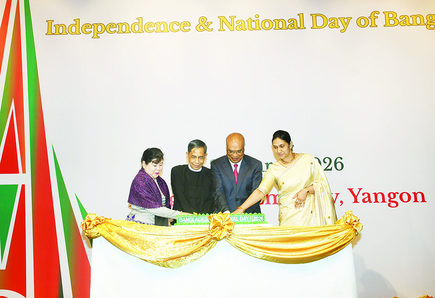 ဘင်္ဂလားဒေ့ရှ်နိုင်ငံ၏ (၅၅) နှစ် မြောက် လွတ်လပ်ရေးနေ့နှင့် အမျိုးသားနေ့အထိမ်းအမှတ် ဧည့်ခံပွဲအခမ်းအနားကို ယနေ့ည ၇ နာရီတွင် ရန်ကုန်မြို့ Lotte Hotel ၌ ကျင်းပရာ နိုင်ငံတော်သမ္မတရုံးဝန်ကြီးဌာန(၂) ပြည်ထောင်စုဝန်ကြီး ဦးကိုကိုလှိုင်နှင့် ဇနီးတို့ တက်ရောက်ကြသည်။