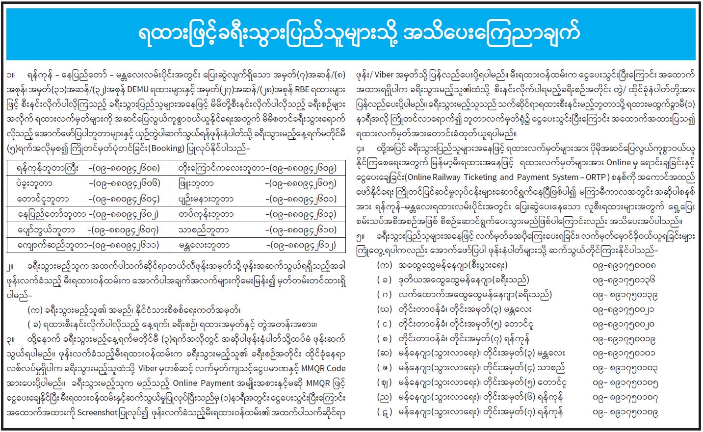 ရထားဖြင့် ခရီးသွားပြည်သူများသို့ အသိပေးကြေညာချက်