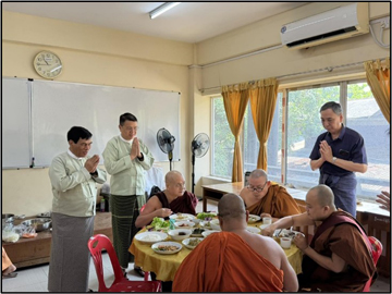 ရန်ကုန်တိုင်းဒေသကြီး၊ ဗဟန်းမြို့နယ်၊ ကမ္ဘာအေးဘုရားလမ်းရှိ အဘိဓမ္မာရတနာဃရဗိမာန်တော်ကြီး၌ အစိုးရဓမ္မာစရိယနှင့် ပါဠိပထမပြန်စာမေးပွဲဖြေဆိုသည့် သံဃာတော်များအား နေ့ဆွမ်း ဆက်ကပ်လှူဒါန်း