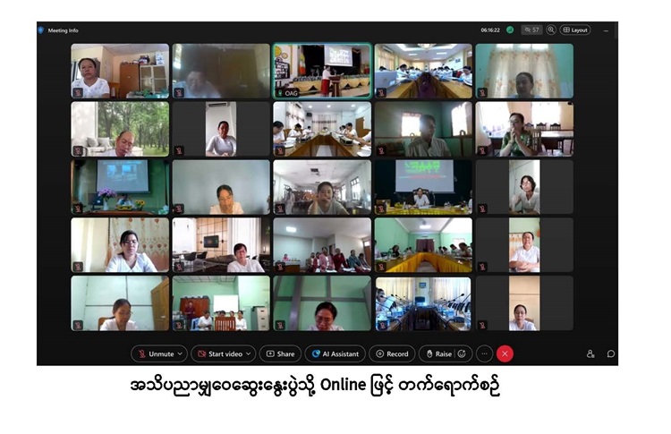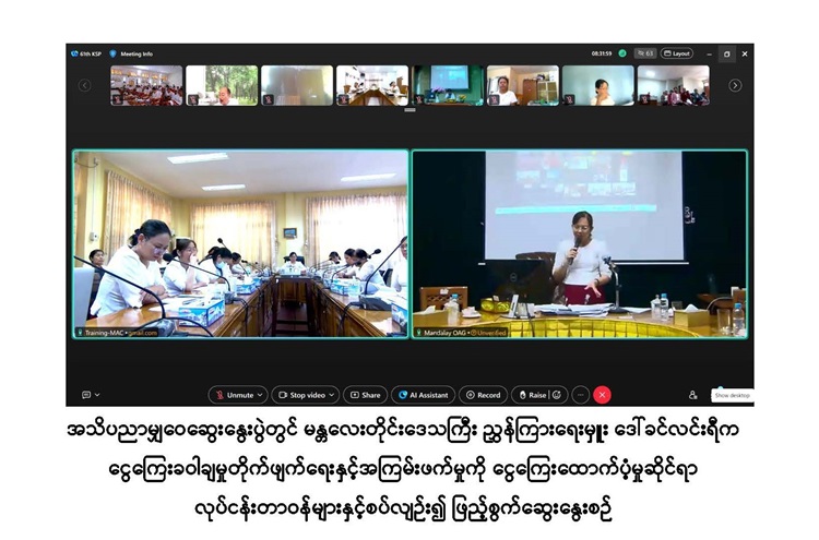 ထို့နောက် နည်းပညာဖွံ့ဖြိုးရေးနှင့်လေ့ကျင့်ရေးဦးစီးဌာန၊ မြန်မာနိုင်ငံစာရင်းကောင်စီရုံး ဒုတိယညွှန်ကြားရေးမှူး(အဖွဲ့ဝင်၊ အုပ်စုလိုက်ပူးပေါင်းကြီးကြပ်ရေးအဖွဲ့) ဒေါ်ခိုင်ဇင်ဝင်းနှင့် လက်ထောက်ညွှန်ကြားရေးမှူး ဒေါ်မိုးမိုးအေးတို့က ကြီးကြပ်ရေးအာဏာပိုင်(MAC) ၏ ငွေကြေး ခဝါချမှုတိုက်ဖျက်ရေးနှင့် အကြမ်းဖက်မှုကို ငွေကြေးထောက်ပံ့မှု (Anti-Money Laundering& Countering the Financing of Terrorism AML/CFT)ဆိုင်ရာ လုပ်ငန်းတာဝန်များနှင့်စပ်လျဉ်း၍ ရှင်းလင်းဆွေးနွေးခဲ့သည်။