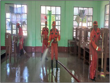 ၂၀၂၅ ခုနှစ်၊ စက်တင်ဘာ ၂ ရက် နံနက် ၈ နာရီ ၃၀ မိနစ်ခန့်က ပြည်ထောင်စုနယ်မြေ၊ နေပြည်တော်၊ တပ်ကုန်းမြို့နယ်၊ အခြေခံပညာအလယ်တန်းကျောင်း(ရွာသစ်)ရှိ စာသင်ခန်းများ၌ ရေဝင်ရောက်မှုကြောင့် တင်ကျန်ခဲ့သော ရွှံ့နွံများအား တပ်ကုန်းမြို့နယ်မီးသတ်စခန်းမှ မီးသတ်တပ်ဖွဲ့ဝင်များသည် မီးသတ်ယာဉ် သုံးစီးဖြင့် သက်ဆိုင်ရာအဖွဲ့အစည်းများနှင့်ပူးပေါင်း၍ ဆေးကြောသန့်ရှင်းခြင်းလုပ်ငန်းများဆောင်ရွက်ခဲ့ရာ နံနက် ၁၁ နာရီ ၄၅ မိနစ်တွင် ပြီးစီးခဲ့ကြောင်း သတင်းရရှိပါသည်။
