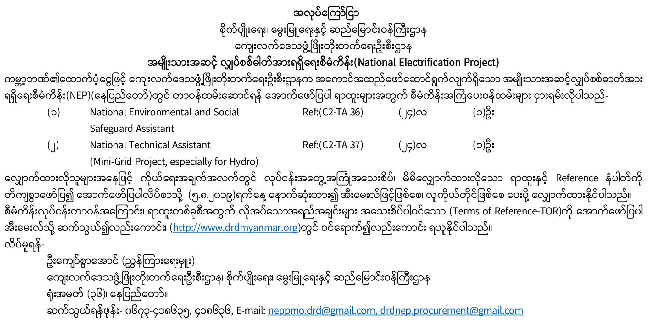 အမျိုးသားအဆင့်လျှပ်စစ်ဓာတ်အား ရရှိရေးစီမံကိန်း (NEP) အတွက် စီမံကိန်းအကြံပေးဝန်ထမ်းများ ခေါ်ယူခြင်း