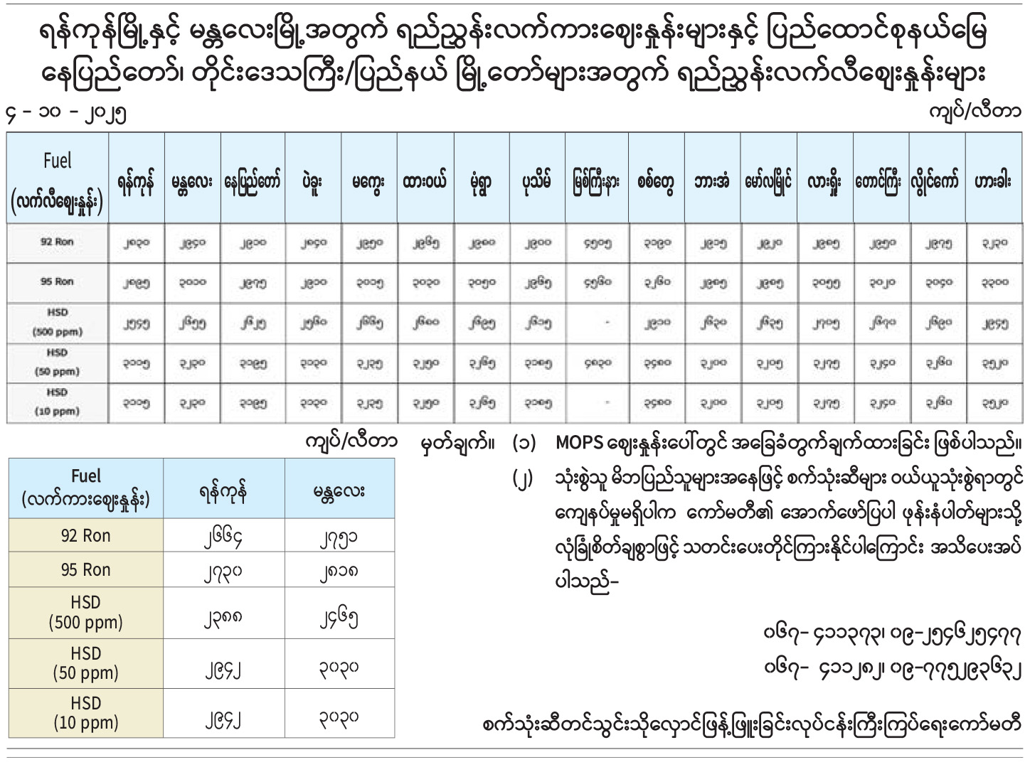 ရန်ကုန်မြို့နှင့် မန္တလေးမြို့အတွက် ရည်ညွှန်းလက်ကားဈေးနှုန်းများနှင့် ပြည်ထောင်စုနယ်မြေ နေပြည်တော်၊ တိုင်းဒေသကြီး/ပြည်နယ် မြို့တော်များအတွက် ရည်ညွှန်းလက်လီစျေးနှုန်းများ