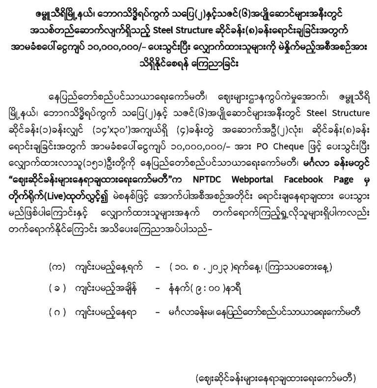 နေပြည်တော်စည်ပင်သာယာရေးကော်မတီ မှ သပြေ(၂)နှင့်သဇင်(၆)အပျိုဆောင်များအနီးတွင် အသစ်တည်ဆောက်လျက်ရှိသည့် Steel Structure ဆိုင်ခန်း(၈)ခန်းရောင်းချခြင်းအတွက် အာမခံစပေါ်ငွေကျပ် ၁၀,၀၀၀,၀၀၀/- ပေးသွင်းပြီး လျှောက်ထားသူများကို မဲနှိုက်မည့်အစီအစဉ်အား သိရှိနိုင်စေရန် ကြေညာခြင်း