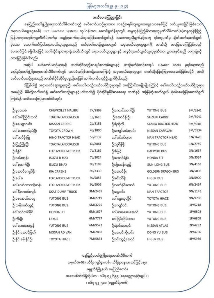 နေပြည်တော်ဖွံ့ဖြိုးရေးဘဏ်လီမိတက်မှ အငှားဝယ်စနစ် (Hire Purchase System) ဖြင့် မော်တော် ယာဉ်များ ဝယ်ယူထားသည့် အငှားဝယ်ယူသူများသည် လစဉ်အရစ်ကျငွေများ ပေးသွင်းရန် ပျက်ကွက်နေ သောကြောင့် သက်ဆိုင်ရာတရားရုံးအသီးသီးတွင် တရားစွဲဆိုထားရှိပါသည်။ အငှားဝယ် ချေးငွေရယူပြီး မော်တော်ယာဉ်ဝယ်ယူထားရှိသူများနှင့် အကြောင်းအမျိုးမျိုးကြောင့် မော်တော်ယာဉ်လက်ဝယ်ရှိသူများအနေ ဖြင့် မော်တော်ယာဉ်များနှင့်ပတ်သက်၍ ပိုင်ဆိုင်မှုခိုင်မာစေရေး ဘဏ်နှင့်အမြန်ဆုံး ဆက်သွယ်ဆောင်ရွက်ကြ ပါရန် အသိပေးကြေညာအပ်ပါသည်။