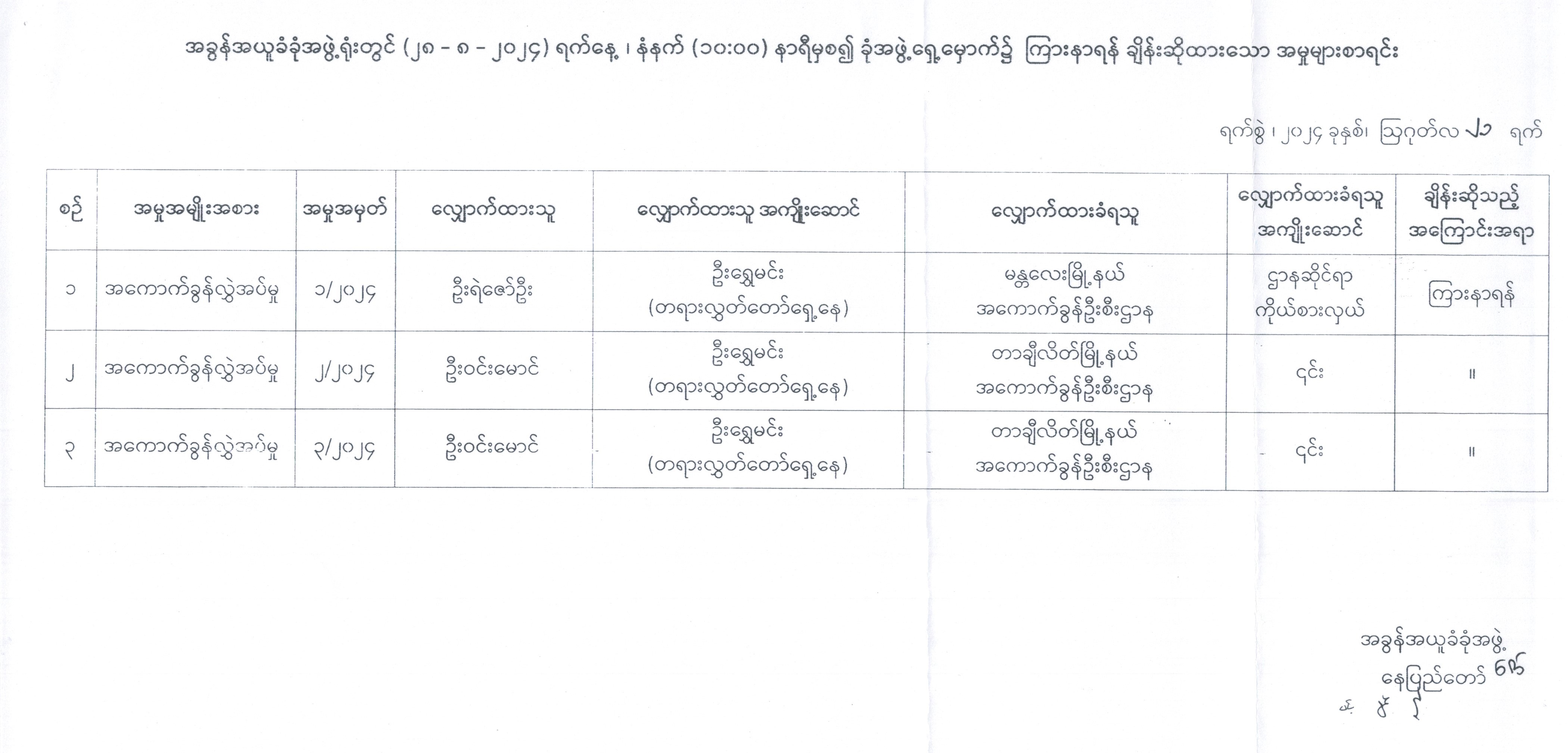 အခွန်အယူခံခုံအဖွဲ့ရုံးတွင် (၂၈-၈-၂၀၂၄) ရက်နေ့၊ နံနက်(၁၀:၀၀) နာရီမှစ၍ ခုံအဖွဲ့ရှေ့မှောက်၌ ကြားနာရန် ချိန်းဆိုထားသော အမှုများစာရင်း